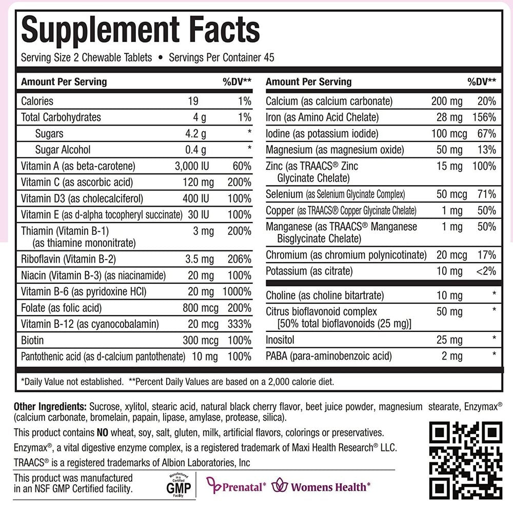 Complete chewable prenatal Cherry flavor We at Maxi-Health Research have created cherry flavored Chewable Maxi Prenatal to ensure the health and energy of you and your fetus. It provides the core building blocks required by all cells, tissues and organs to maintain and promote optimum function. Amino Acid Chelates - selected mineral and trace elements with maximum bioavailability, tolerability and safety. We use only the finest mineral amino acid chelates, formulated to survive the gastrointestinal system, and protect the sensitive mucosal membranes of the stomach and intestines from irritation.! Vitamin C - to support blood vessel, capillary, and vein strength and helps support a healthy immune system. Natural Vitamin E (d-alpha tocopheryl succinate) - found to be superior in absorption to the synthetic forms (dl type) and its respective acetates. Biotin - a cofactor for several enzymes, and is essential for carbohydrate metabolism and the synthesis of proteins. Biotin supports the growth and development of healthy nerve tissue and aids in the use of B vitamins and synthesis of ascorbic acid. Pantothenic acid - Supports a healthy immune system and also aids in the production of hormones. It is essential for proper metabolism of food and is vital during pregnancy. Iron (as TRAACS) is a patented, nutritionally functional amino acid chelate form of iron. Human clinical studies have shown it to be an iron of great bioavailability and tolerance (easy on the system). Magnesium (magnesium citrate) - This natural source of magnesium provides the body with additional magnesium as well as a non-irritating stool softener much needed during pregnancy. Inositol - provides the nutrient necessary to make cellular membranes. It helps to maintain proper electrical energy and nutrient transfer across the cell membrane. It's your bundle of joy, handle with care! You can trust Chewable Maxi Prenatal to protect you both! These statements have not been evaluated by the Food and Drug Administration. This product is not intended to diagnose, treat, cure, or prevent any diseases.