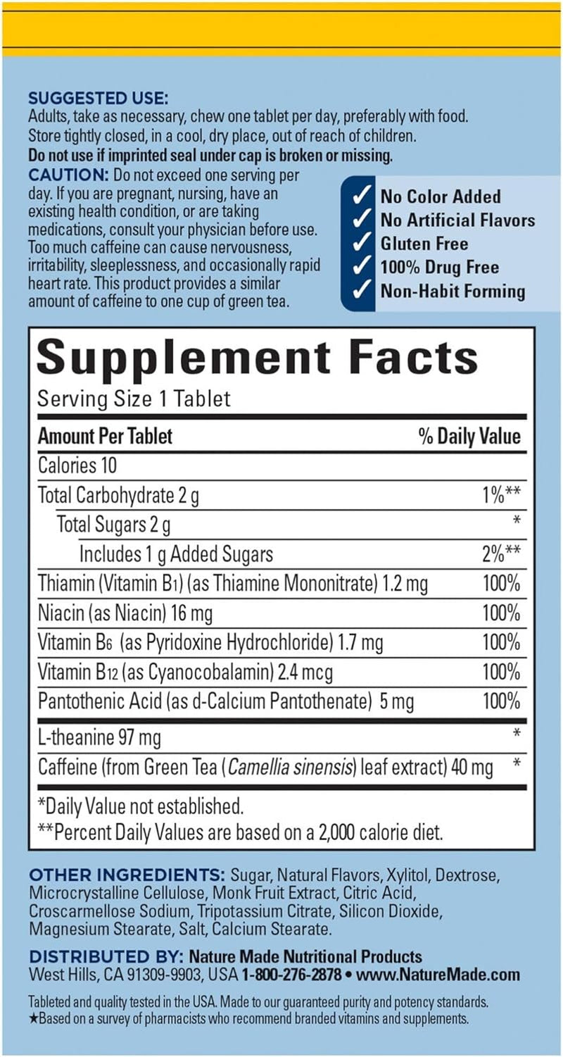 Nature Made Clear & Focus, L-Theanine and Low-Dose Green Tea Caffeine, Helps Reduce Mental Fatigue and Supports Focus, Five B Vitamins for Cellular Energy Support, Lemon Mint, 30 Chewable Tablets