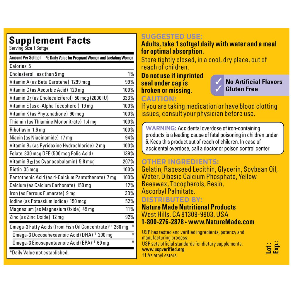 Nature Made Postnatal Multivitamin + DHA is designed to support the increased nutritional needs of nursing moms while continuing to support baby’s development while breastfeeding. Energy requirements are higher during lactation and the body needs certain nutrients in adequate amounts to meet those increased energy demands. This postnatal multivitamin offers higher amounts of Vitamins A, C, D3, and E, compared to our Prenatal Multi + DHA, to support mom’s nutritional needs while breastfeeding. Each serving (1 softgel) contains postnatal Vitamins A, C, D3, E, plus all 8 B vitamins - and also includes DHA, Calcium, Iron, Iodine, Magnesium, and Zinc. DHA is an important Omega-3 fatty acid that helps support fetal brain and eye development. Calcium and Vitamin D work together to build and support strong bones for both baby and mom. Iron is vital for red blood cell formation and to deliver oxygen to cells throughout the body. Nurse healthy habits while nursing, with Nature Made Postnatal Multivitamin + DHA. USP has tested and verified ingredients, potency and manufacturing process. USP sets official standards for dietary supplements. Visit the USP verified website for more information.CAUTION: If you are taking medication or have blood clotting issues, consult your physician before use.WARNING: Accidental overdose of iron-containing products is a leading cause of fatal poisoning in children under 6. Keep this product out of reach of children. In case of accidental overdose, call a doctor or poison control center immediately.