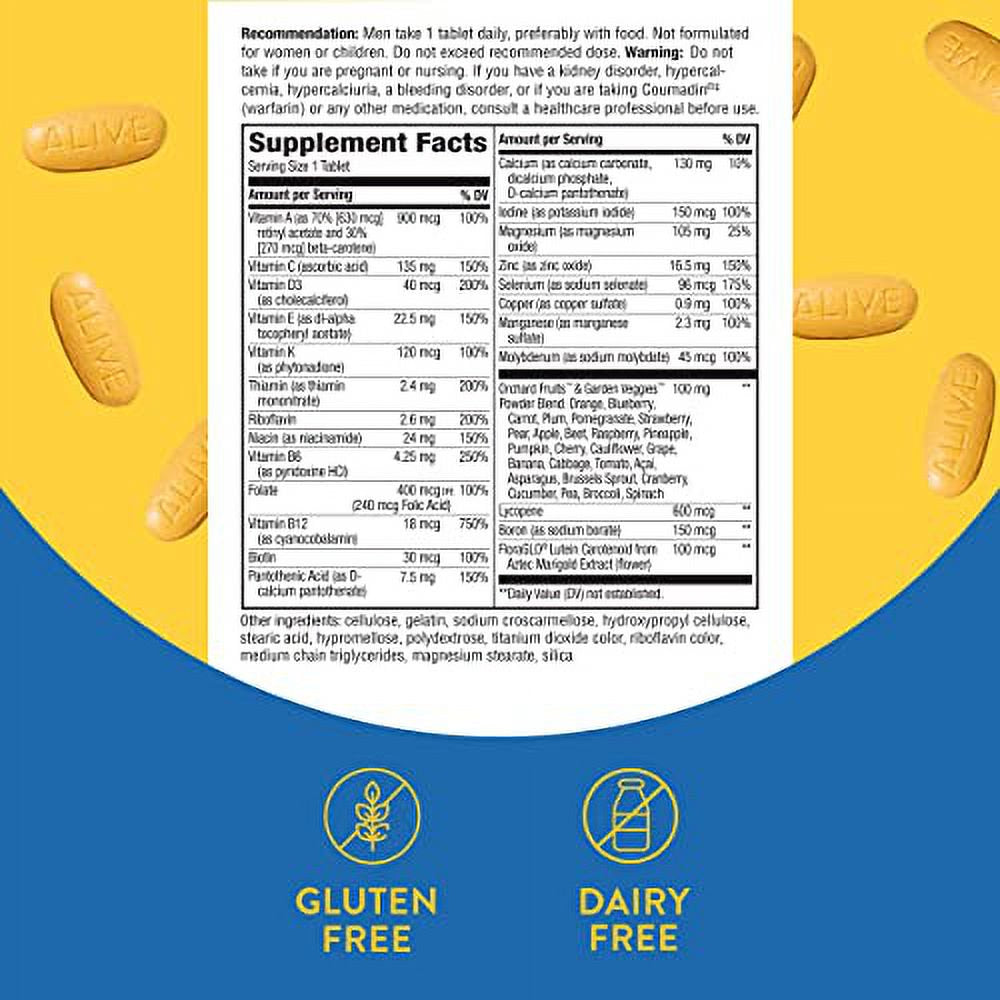 • Nature's Way Alive! Complete Energy Multivitamin for Men supports heart health, muscle function, eye health, immune health, and cellular energy.* • This multivitamin contains 100% or more Daily Value of 19 essential vitamins and minerals, including zinc, selenium, and vitamin D, with high potency B-vitamins, including B12, riboflavin, niacin, biotin, and folate, to help convert food into fuel.* • Men take 1 tablet daily, preferably with food, to support multiple body systems.* • Gluten-free. No yeast-derived ingredients, wheat or dairy. • At Nature’s Way, we believe nature is the ultimate problem solver. For over 50 years, we have looked to the natural world for inspiration. Our quality vitamins and supplements are formulated to help you find your way to wellness.