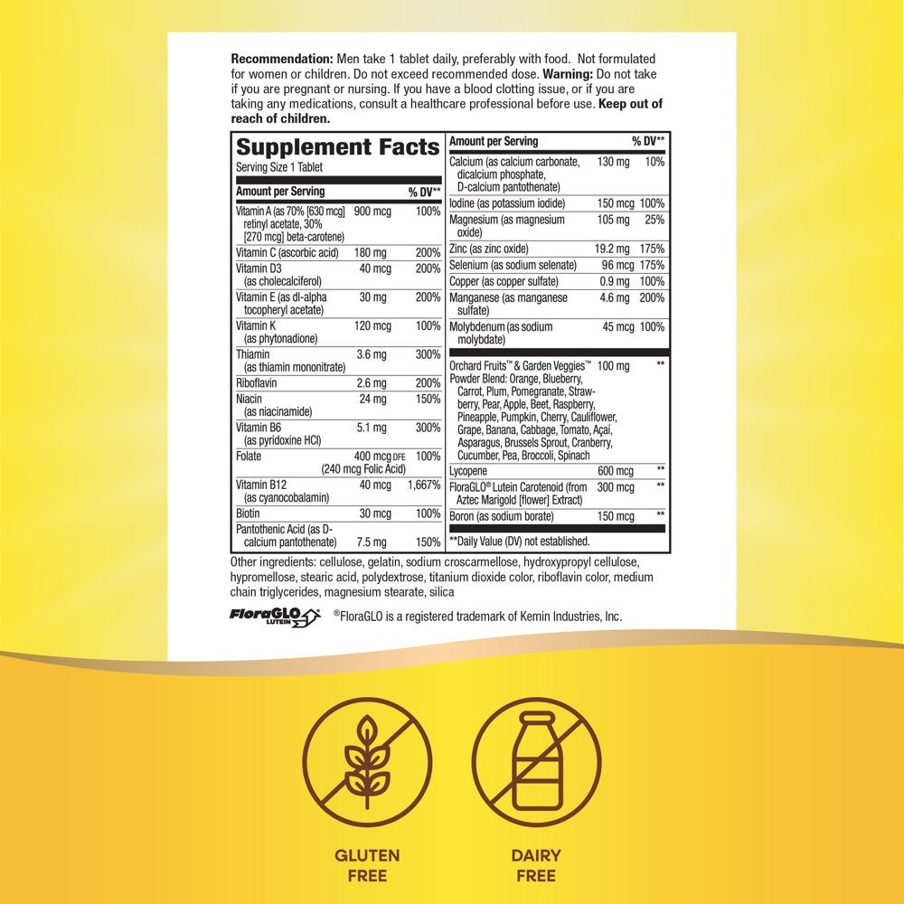 1 Tablet: Vitamin A (as 70% [630 mcg] 900 mcg Retinyl Acetate and 30% [270 mcg] Beta Carotene) (100% Daily Value) Vitamin C (Ascorbic Acid) 180 mg (200% DV) Vitamin D3 (as Cholecalciferol) 40 mcg (200% DV) Vitamin E (as dl-Alpha Tocopheryl Acetate) 30 mg (200% DV) Vitamin K (as Phytonadione) 120 mcg (100% DV) Thiamin (as Thiamin Mononitrate) 3.6 mg (300% DV) Riboflavin 2.6 mg (200% DV) Niacin (as Niacinamide) 24 mg (150% DV) Vitamin B6 (as Pyridoxine HCI) 5.1 mg (300% DV) Folate 400 mcg DFE (240 mcg Folic Acid) (100% DV) Vitamin B12 (as Cyanocobalamin) 40 mcg (1667% DV) Biotin 30 mcg (100% DV) Pantothenic Acid (as D-Calcium Pantothenate) 7.5 mg (150% DV) Calcium (as Calcium Carbonate, Dicalcium Phosphate, D-Calcium Pantothenate) 130 mg (10% DV) Iodine (as Potassium Iodide) 150 mcg (100% DV) Magnesium (as Magnesium Oxide) 105 mg (25% DV) Zinc (as Zinc Oxide) 19.2 mg (175% DV) Selenium (as Sodium Selenate) 96 mcg (175% DV) Copper (as Copper Sulfate) 0.9 mg (100% DV) Manganese (as Manganese Sulfate) 4.6 mg (200% DV) Molybdenum (as Sodium Molybdate) 45 mcg (100% DV) Sodium 5 mg (<1% DV) Orchard Fruits and Garden Veggies 100 mg** Powder Blend (Blueberry, Orange, Carrot, Pomegranate, Plum, Strawberry, Apple, Beet, Pear, Tomato, Raspberry, Broccoli, Cherry, Spinach, Cauliflower, Grape, Acai, Asparagus, Banana, Brussels Sprout, Cabbage, Cranberry, Cucumber, Pea, Pineapple, Pumpkin) Lycopene 600 mcg** Lutein Carotenoid from FloraGLO Aztec Marigold Extract (Flower) 300 mcg** Boron (as Sodium Borate) 150 mcg** Cellulose Sodium Croscarmellose Gelatin Hydroxypropyl Cellulose Stearic Acid Hypromellose Magnesium Stearate Polydextrose Silica Titanium Dioxide Color Riboflavin Color Medium Chain Triglycerides **Daily Value (DV) not established/div>