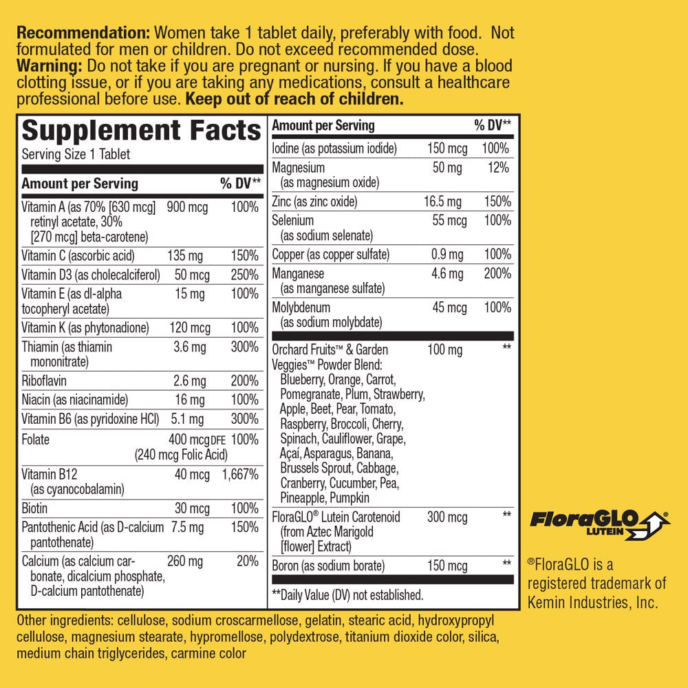 Nature's Way Alive! Women's 50+ Complete Multivitamin is a daily multivitamin optimized for women age 50+. Supports heart health, bone health, brain function, eye health, immune health, and energy metabolism.* Formulated with 100% or more Daily Value of 19 essential vitamins and minerals and is an excellent source of calcium and contains high potency vitamins B12 and D3. Contains food-based Orchard Fruits & Garden Veggies powder blend (100 mg per serving).