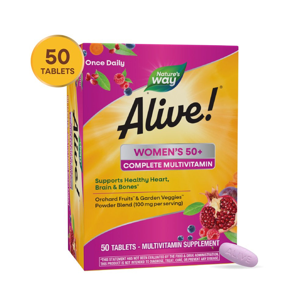 - Nature's Way Alive! Women's 50+ Complete Multivitamin tablets support heart health, bone health, brain function, and more.*