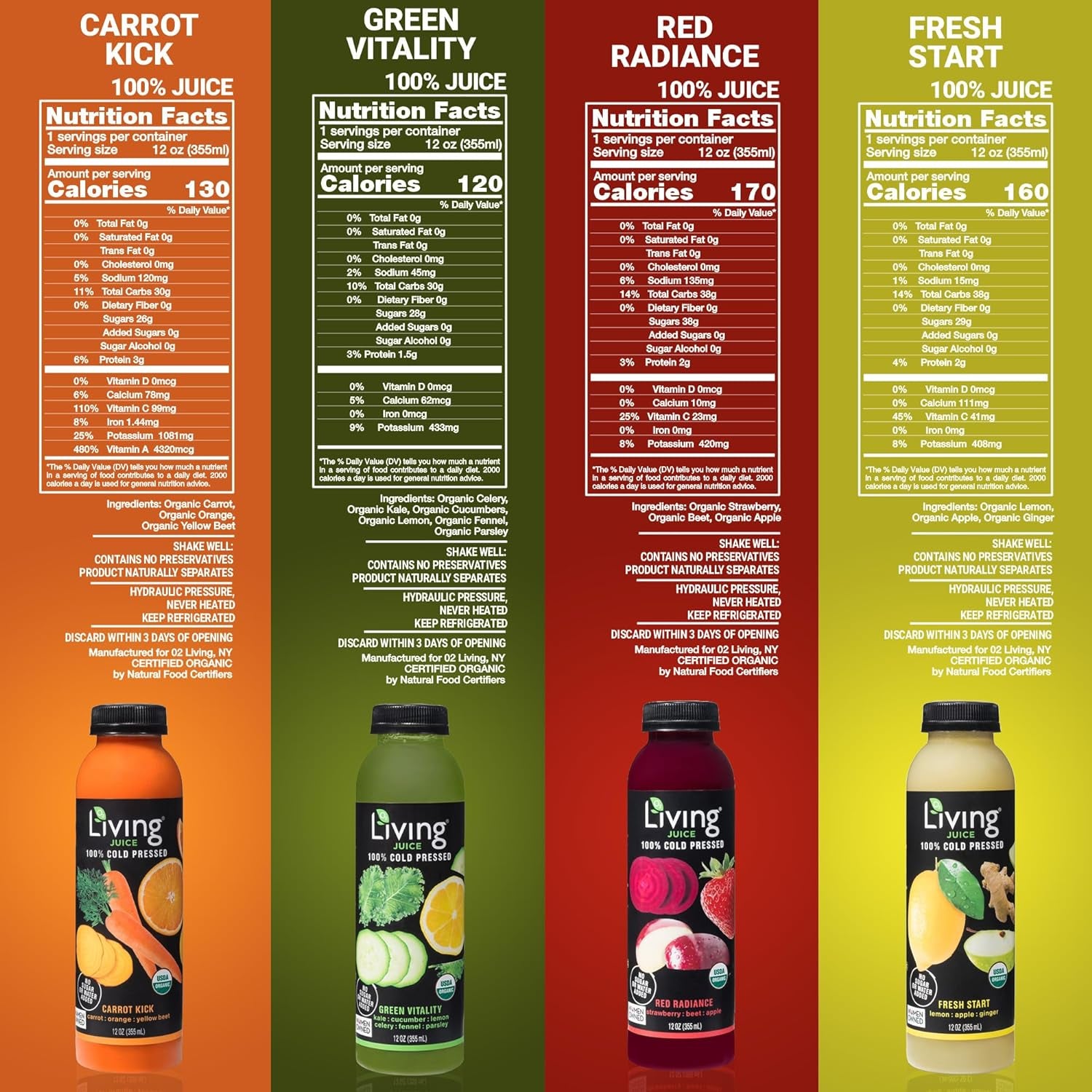 • DELICIOUS FLAVORS: O2Living's Cold Pressed Juices Healthy Cleanse Detox features five incredible flavors. Carrot Kick combines orange juice, carrot juice, and yellow beet juice to promote healthy skin and eyes while lowering cholesterol and cleansing your kidneys. Red Radiance blends strawberries with beet juice and apple juice for a delicious beverage that supports heart health.