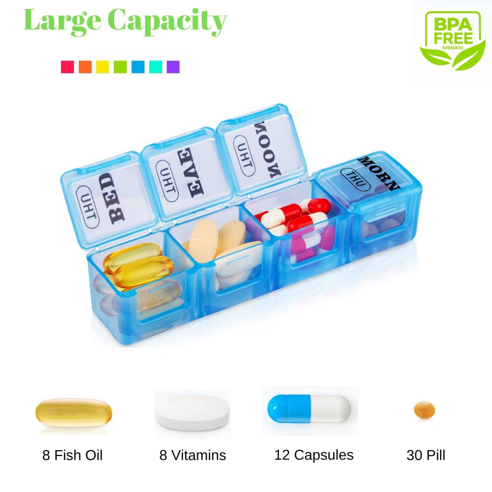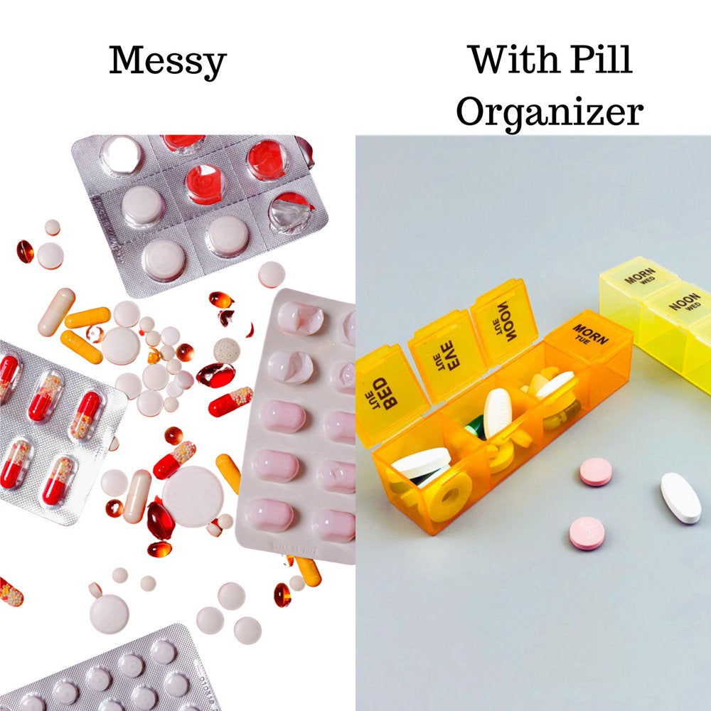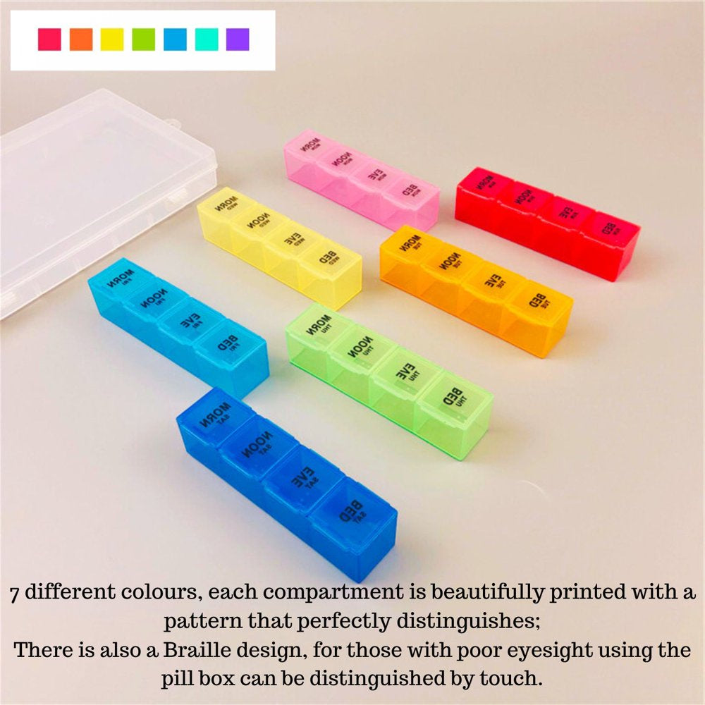 - 4 Times a Day Pill Organizer: Recording daily activities (morning, midday, evening and night) The 7 Day Pill Organizer makes it easy to organise your week's pills, sort them into categories, and the pill box is easy to use and won't fall out after over 5,000 uses.