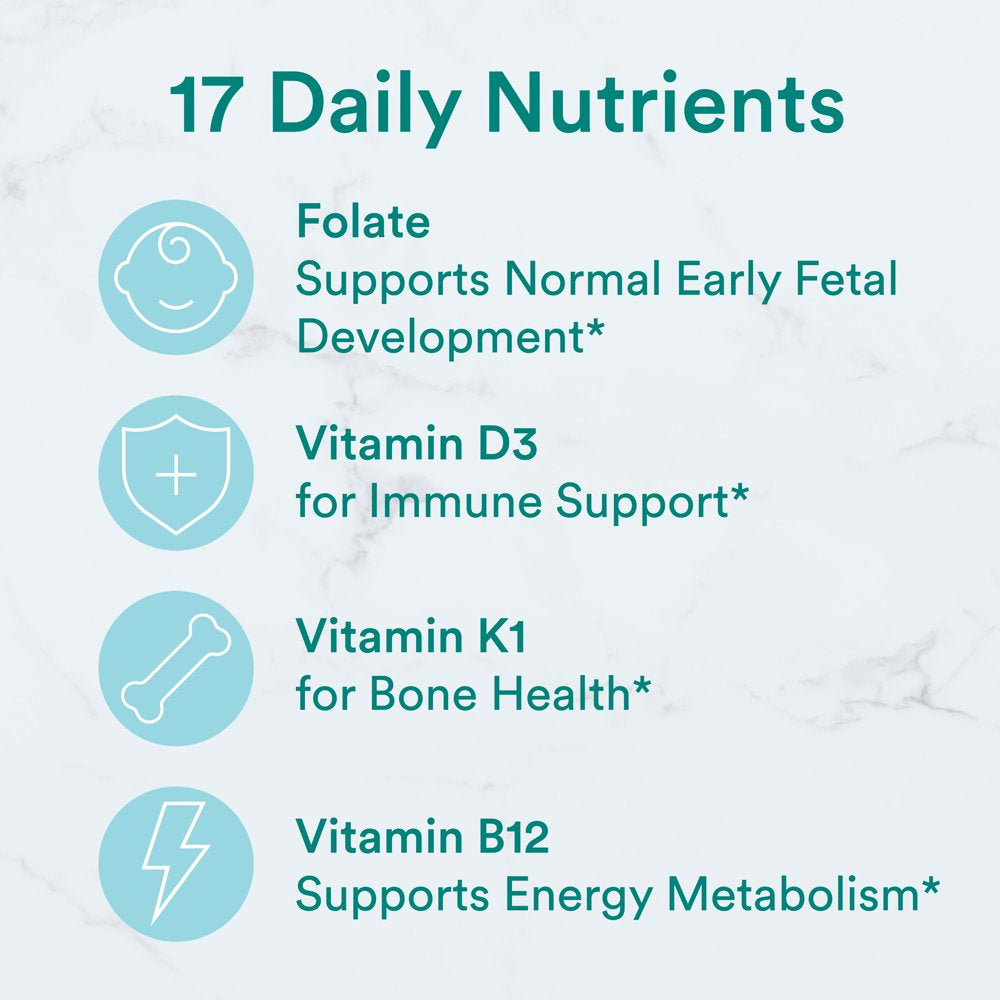 - 17 essential nutrients including folate as methylfolate for development of the fetal brain and spinal cord, vitamin D3 for immunity, vitamin B12 to support energy metabolism, vitamins K1 for bones, vitamin C for immunity, vitamin A to help build strong bones and teeth*