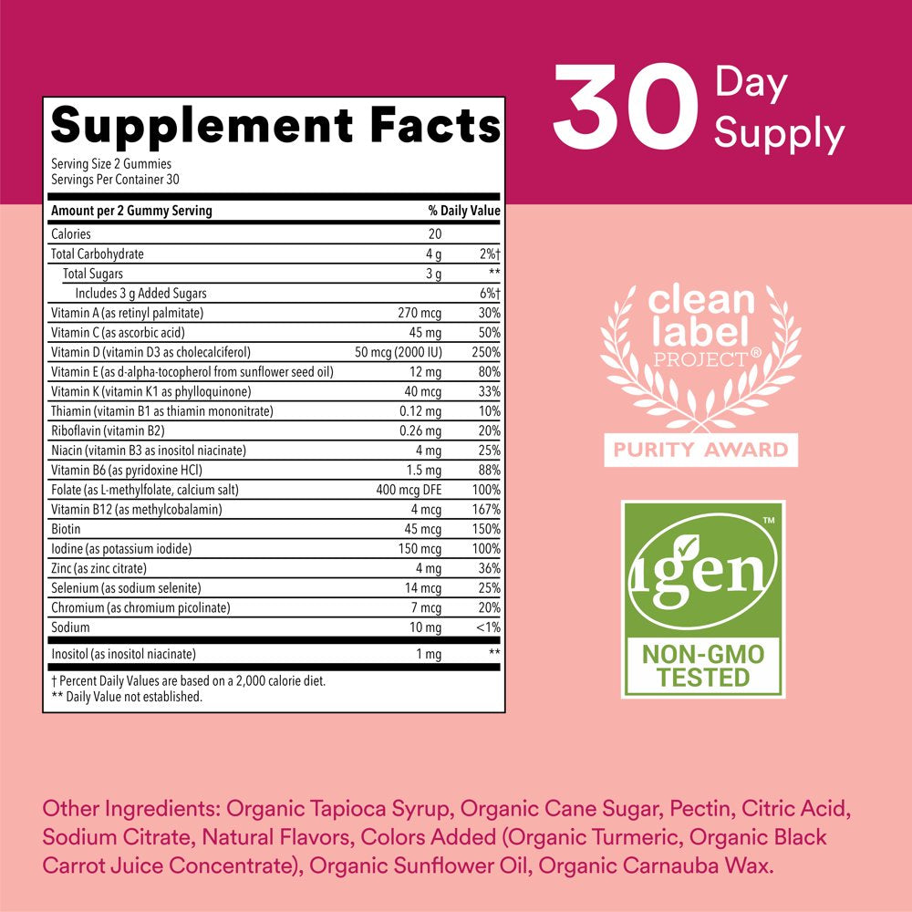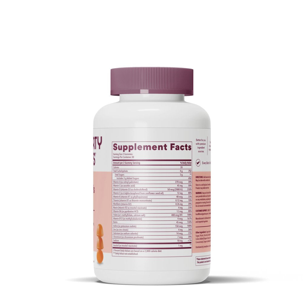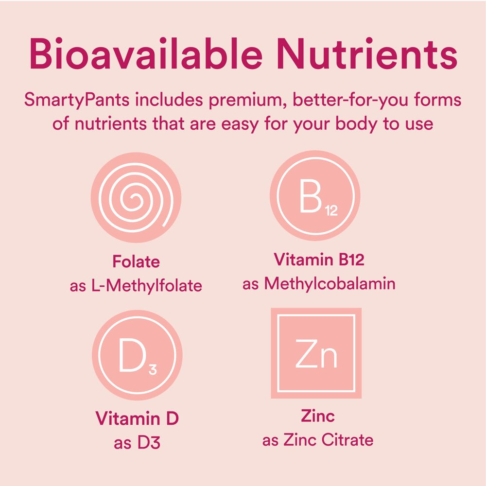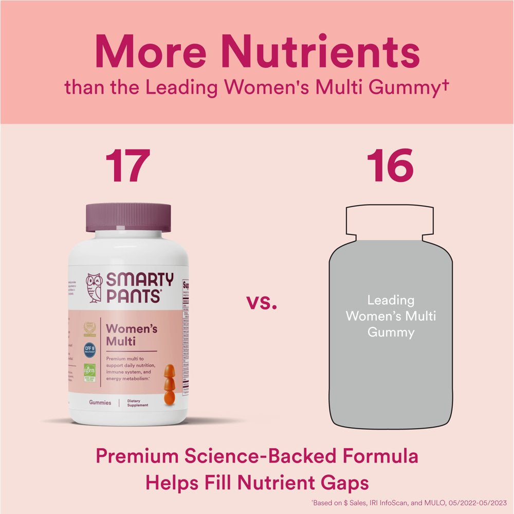 SmartyPants Women's Multi gummies are made with 17 premium nutrients including vitamin D3 for immunity, vitamin B12 to support energy metabolism, vitamin K1 for bone health, biotin to maintain healthy hair, skin and nails, vitamin E, vitamin C for immunity, vitamin A for eye health, and folate as methylfolate, all in one delicious gummy serving without any of the junk.*