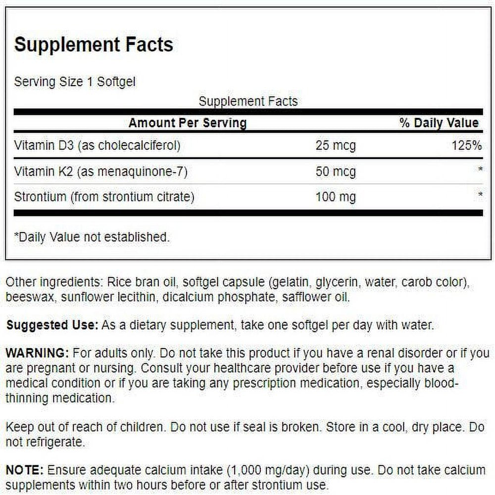 When you're looking for serious bone-building nutrition, Swanson Vitamins D3 and K2 with Strontium delivers. Chemically similar to calcium, the trace mineral strontium plays a valuable role in bone formation, helping to maintain healthy bone mineral density. But unless you eat a lot of seafood every day, you probably don't get very much of it in your diet. Our Vitamins D3 and K2 with Strontium softgels deliver 100 mg of strontium from strontium citrate fortified with a generous supply of vitamin D3 and vitamin K2 to ensure optimal absorption. Vitamin D helps build strong bones by increasing the body's absorption of calcium and phosphorus. Vitamin K supports the health of bones and cardiovascular system as it helps direct calcium out of the arteries and to the bones. New understanding of the interaction of vitamins D and K suggests that vitamin D enhances the concentration of bone proteins that rely on vitamin K for healthy bone formation and in turn, the essential mineralization