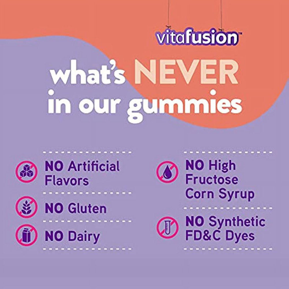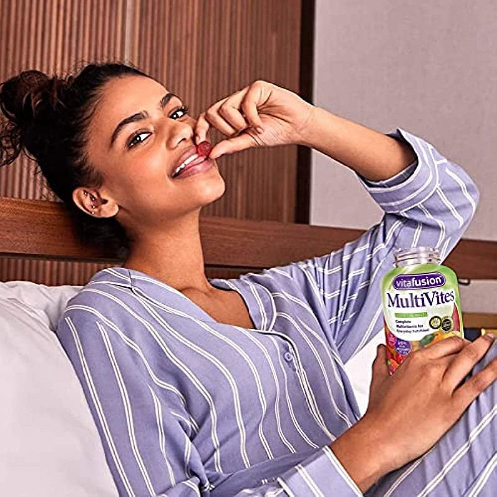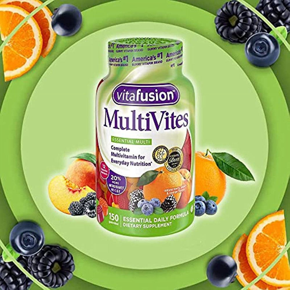 Vitafusion MultiVites provide a fusion of essential vitamins, minerals and natural fruit flavors in a delicious gummy. This complete multivitamin is specially formulated for adults and provides a great-tasting and convenient alternative to traditional, hard-to-swallow pills. Essential daily formula. 2 gummies have as much: vitamin A as 1 cup of broccoli, vitamin C as 1 tangerine, vitamin D as 3 oz of salmon. 200% vitamin D. Natural colors and flavors.