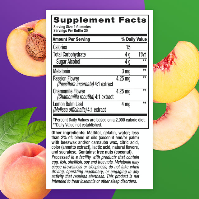 One serving of vitafusion Sleep Well Melatonin Gummy Supplements has 3 mg of melatonin to support sleep, maintain rest management, help with jet lag recovery, and support sleep cycle regulation. 1 This delicious sugar-free melatonin 3 mg gummy combines natural white tea and peach flavors for a tasty, sleep-supporting alternative to hard-to-swallow pills. 1 And if you're looking for nightly sleep-aid gummies with a dose of melatonin, these sleep vitamins from vitafusion could be just what you need to sleep well. At vitafusion, we believe taste and nutrition can be fused together to deliver the best vitamin experience, ensuring it’s an easy and delicious part of your day. For over 12 years, we’ve been helping people to live happy and healthy lives with our gummy vitamins and supplements. Anything is possible when great nutrition is your foundation. Take a fruitful step toward a healthier, happier world with gummy vitamins from Vitafusion, the gummy vitamin experts . Vitamin Better! Look for our wide selection of melatonin gummies, including melatonin gummies for kids. 1 These statements have not been evaluated by the Food and Drug Administration. This product is not intended to diagnose, treat, cure or prevent any disease.