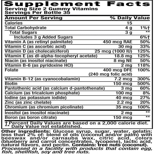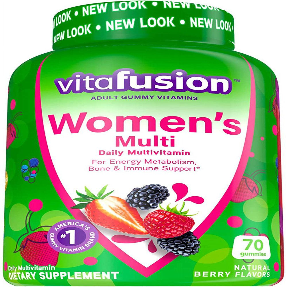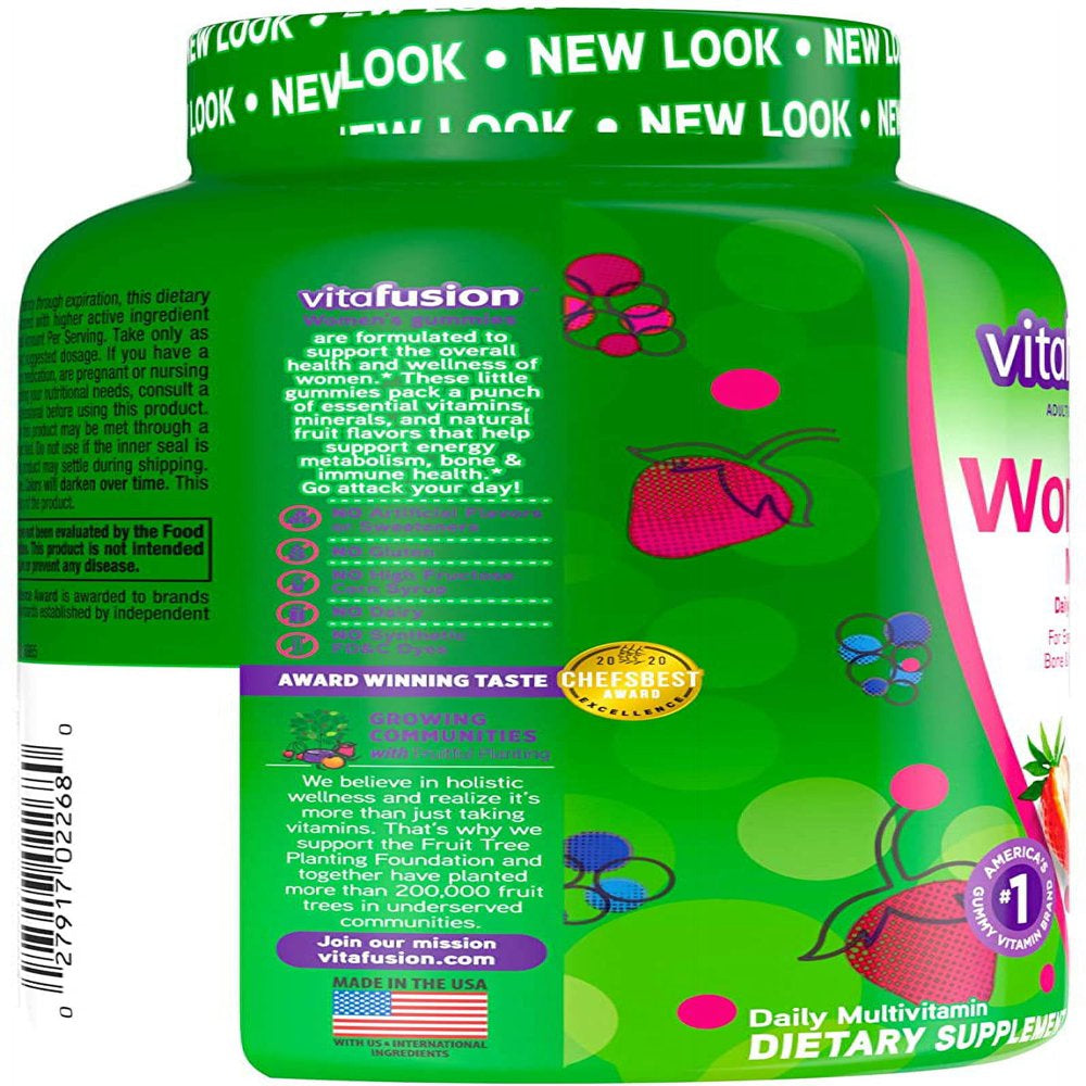 Product Description About this item A complete multivitamin + Antioxidant vitamins C and E specially formulated to support the specific health needs of women From America's #1 Gummy Vitamin Brand A convenient alternative to hard-to-swallow pills. Contains NO high-fructose corn syrup, NO artificial sweeteners, NO gluten, NO dairy and NO synthetic (FD&C) dyes Recipient of the 2018 ChefsBest Excellence Award. The ChefsBest Excellence Award is awarded to brands that surpass quality standards established by independent professional chefs. vitafusion Women's multivitamin provides a delicious, complete multivitamin specially formulated to support the health needs of women. Each delicious two-gummy serving combines essential vitamins and minerals with natural fruit flavors to provide: Energy metabolism and bone support[1]; An excellent source of Vitamins A, C & D. Award-winning taste with delicious, natural berry flavors. At vitafusion, we believe taste and nutrition can be fused together to deliver the best vitamin experience, ensuring it’s an easy and delicious part of your day. For over 12 years, we’ve been helping people to live happy and healthy lives with our gummy vitamins and supplements. Vitafusion is the only gummy vitamin brand with products that have been awarded the ChefsBest Excellence award for taste. [2] Anything is possible when great nutrition is your foundation. Take a fruitful step toward a healthier, happier world with America’s #1 gummy vitamin brand. Vitamin Better! [2] The ChefsBest Excellence Award is awarded to brands that surpass quality standards established by independent professional chefs. [1] These statements have not been evaluated by the Food and Drug Administration. This product is not intended to diagnose, treat, cure or prevent any disease.