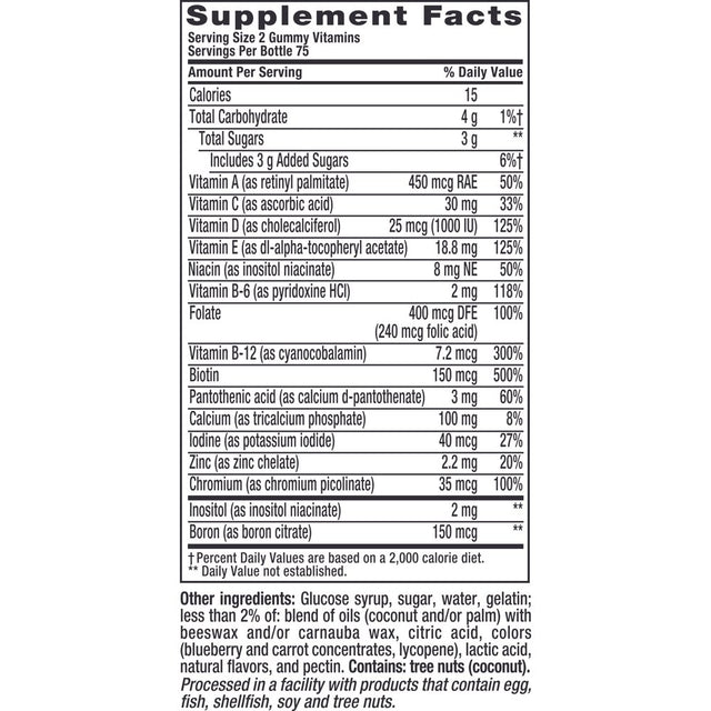 Vitafusion Womens Multivitamin Gummies are daily vitamins formulated to address the health needs of women (1). Each delicious two-gummy serving combines essential vitamins and minerals with natural fruit flavors to provide a great-tasting, convenient alternative to traditional, hard-to-swallow vitamin pills. Vitafusion believes that taste and nutrition can be fused together, ensuring that taking your daily multivitamin is an easy and delicious part of your day. Each serving provides support for your immune system, energy metabolism and bone health (1) with Vitamin A, Vitamin C, and Vitamin D. This women's multivitamin also contains Vitamins E, B-6 and B-12, along with Biotin, Zinc, Calcium and Folate. These daily multivitamins for women contain no high-fructose corn syrup, no artificial sweeteners, no gluten, no dairy and no synthetic FD&C dyes. This 150-count bottle of vitamin gummies has enough for 75 days. Vitafusion is the only gummy vitamin brand with products that have been awarded the ChefsBest Excellence award for taste; vitafusion Adult Gummy Multivitamins for Women were the recipient of the 2021 ChefsBest Excellence Award (2). Take a fruitful step toward a healthier, happier world with America’s #1 Gummy Vitamin Brand.(1) These statements have not been evaluated by the Food and Drug Administration. This product is not intended to diagnose, treat, cure or prevent any disease. (2) The ChefsBest Excellence Award is awarded to brands that surpass quality standards established by independent professional chefs. Evaluation funded by Church & Dwight Co., Inc.