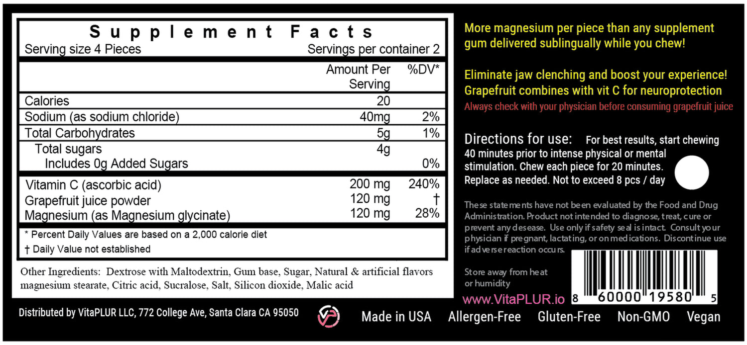 VitaPLUR Gum's enhanced sublingual delivery can provide up to 3X more magnesium benefits 5X faster than other methods. Making it easy to BOOST Energy, Mood, Sleep Quality & Athletic performance while reducing stress, muscle cramping and near total elimination of jaw clenching (TMJ). Just by chewing this brilliant tasting gum! No pills to take or annoying powders to mix. That's not all! Each piece also enhances immunity with vitamin C and lycopene! Many times more active ingredients than other functional gums on the market. VitaPLUR E-BOOST Magnesium & Grapefruit Supplement Gum with C Vitamins, Kinetic Orange Flavor, 8 Pieces