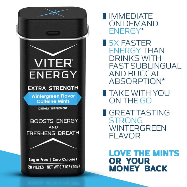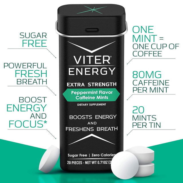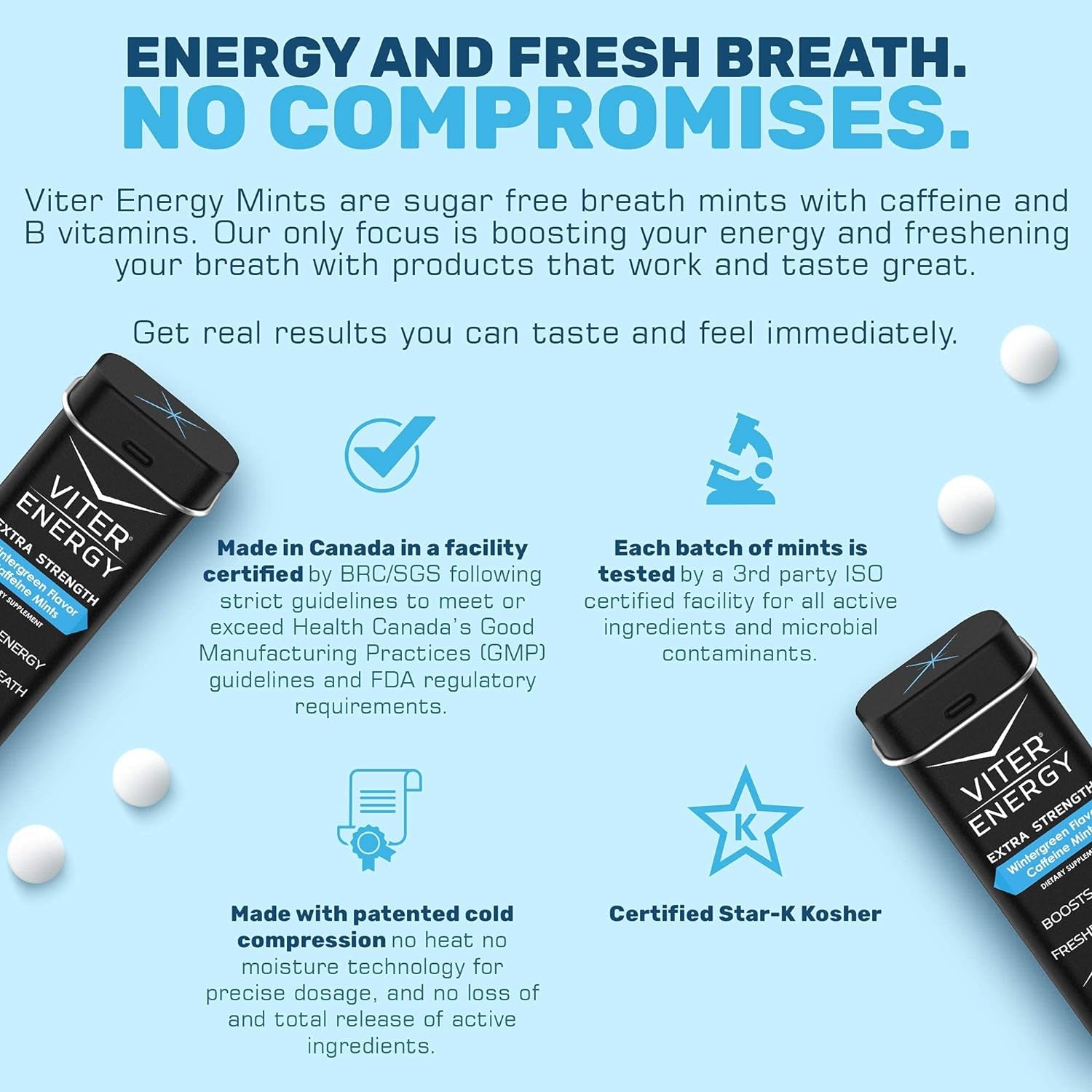- Powerful Flavor & Fresh Breath - Extra Strength Viter Energy Mints have a strong and intense flavor kick to help you wake up and stay alert! Each tin contains 20 mints for on demand anytime instant alertness, performance, focus, and mental clarity. Forget bad tasting energy shots, drinks that spill and jittery 100mg caffeine pills. Enjoy a flavorful minty fresh breath blast without chewing gum, eating chews or gel, lozenges or chewable caffeinated candy, and give your mouth a fresh clean feel.