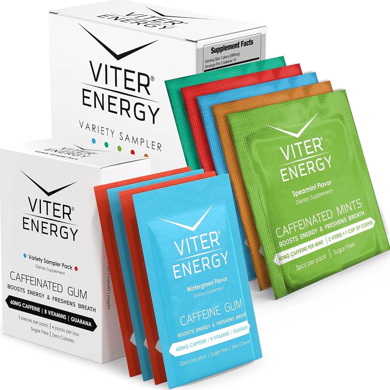 Viter Energy Original Caffeine Mints and Caffeine Gum Variety Flavor Sampler Pack Bundle - Caffeine, B Vitamins, Sugar Free, Vegan, Powerful Energy Booster for Focus and Alertness