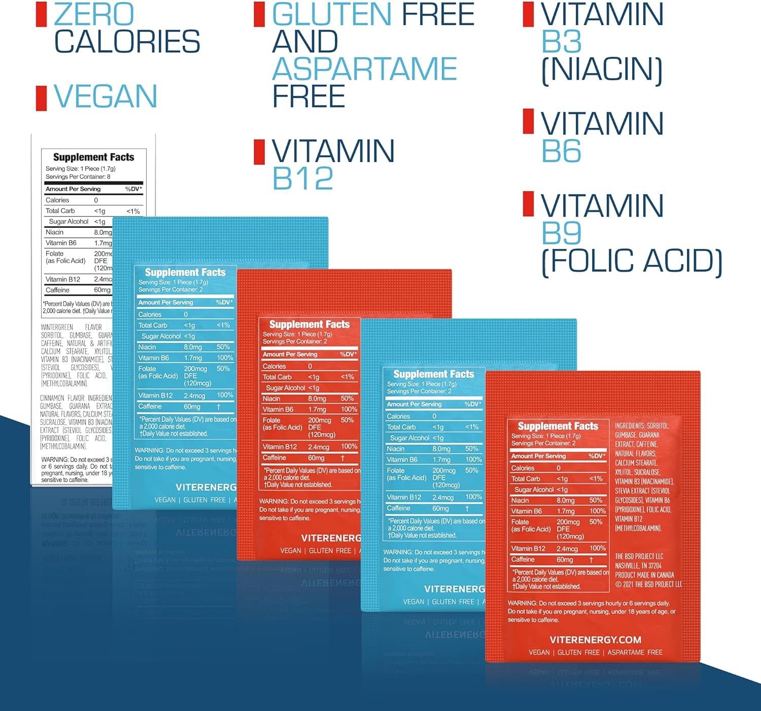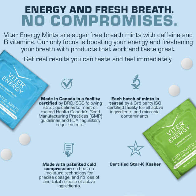 - Powerful Flavor & Fresh Breath - Viter Energy products have a strong and intense flavor kick to help you wake up and stay alert! Each sampler pack of mints contains 3 mints and each sampler pack of gum contains 2 pieces for on demand anytime instant alertness, focus, and mental performance. Forget bad tasting energy shots, drinks that spill and jittery 100mg caffeine pills. Enjoy a flavorful minty fresh breath blast without eating chews or gel, gummies, lozenges or chewable caffeinated candy.