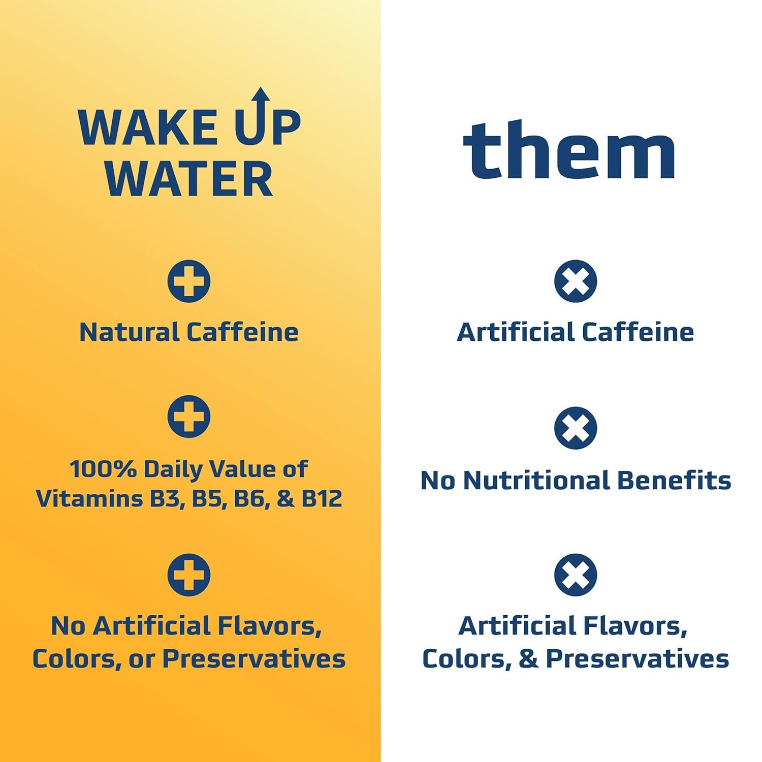 - ALL NATURAL - With 175mg of natural caffeine (same as a medium cup of coffee), electrolyte levels of the leading sports drink, 100% of your daily value of key B vitamins, naturally sweetened with no aftertaste and NO artificial ingredients Wake Up Water is perfect for any diet or fitness routine whether you’re eating clean or staying lean it’s optimized fuel for anytime you need rapid hydration and smooth energy
