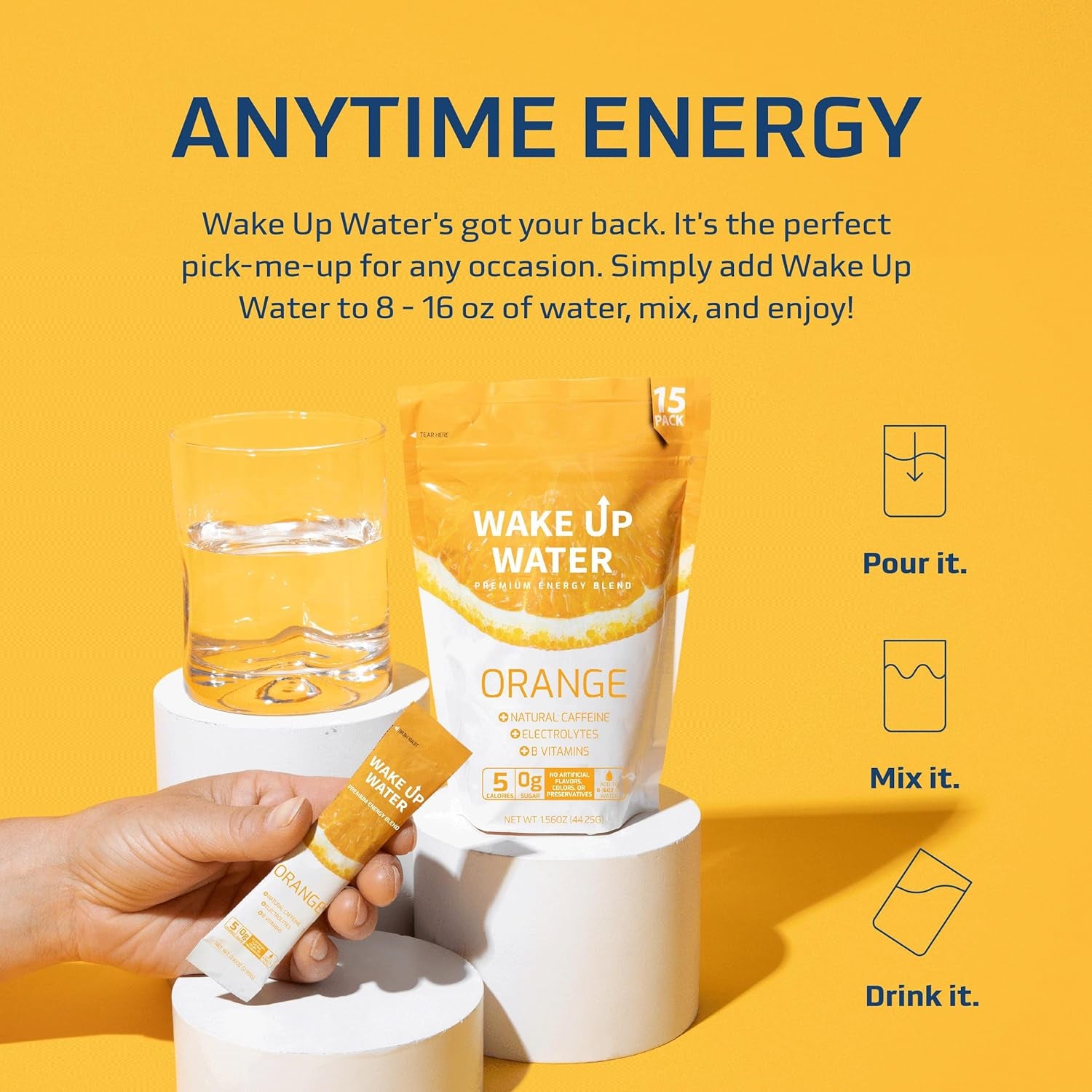 Wake up Water Energy + Hydration Mix – Energy + Hydration Powder Packets with Natural Caffeine, Electrolytes, B Vitamins | No Sugar | Daily Fuel with No Crash or Jitters | (Orange) - Orange is backordered and will ship as soon as it is back in stock.