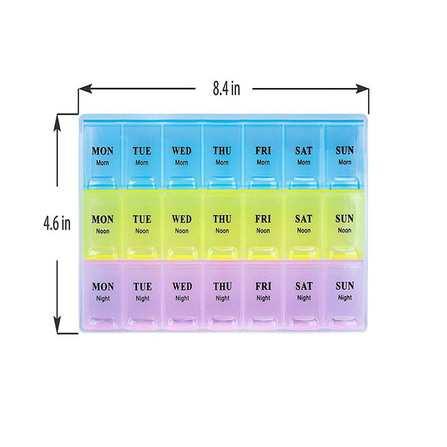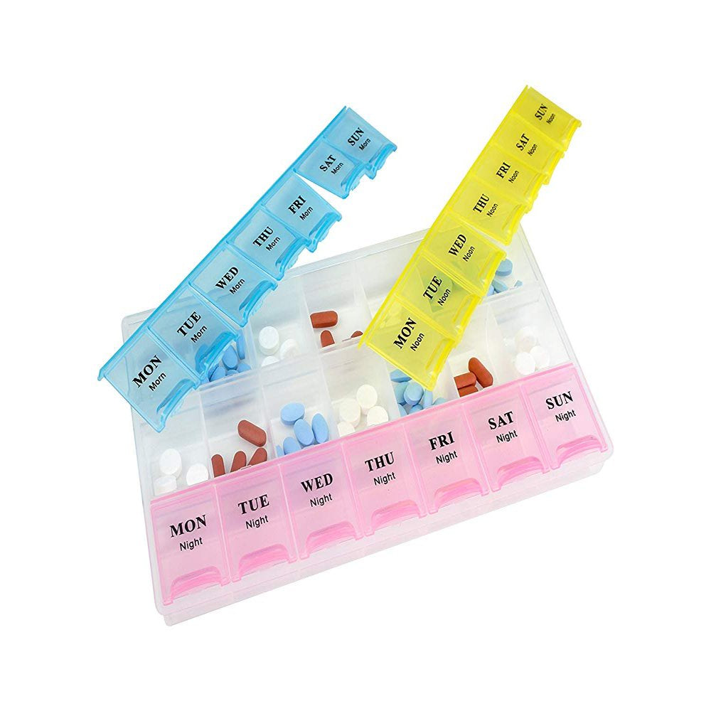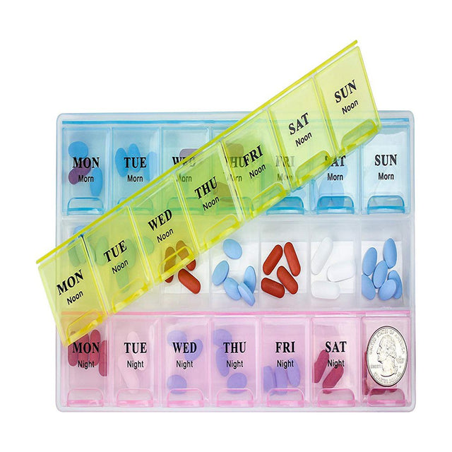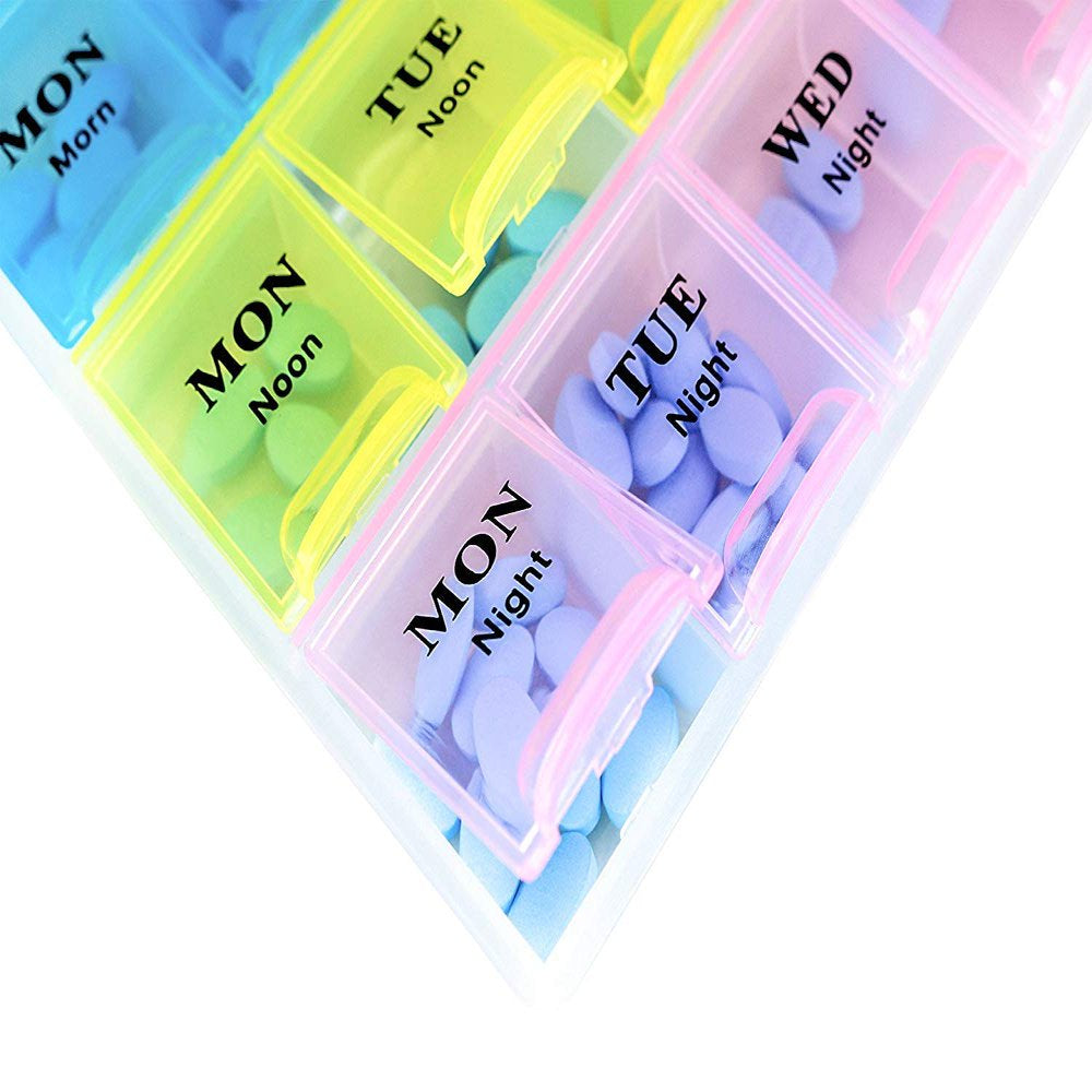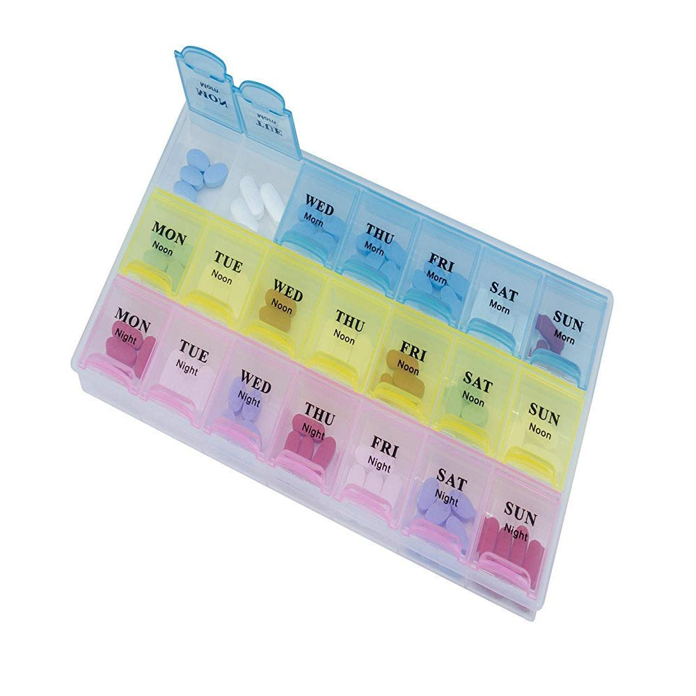 Best design this pill manager has everything to make it the best choice. It consists of 21 compartments, each with a separate snap cover. The lid is translucent so you can check your regularity without even opening the lid. Each cover has the first three letters of the week with morning, noon and evening labels on it. Light weight, small size, very suitable for long-distance travel.