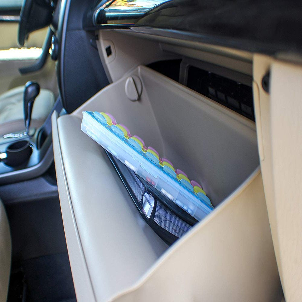 - PACK OF 2 - EXCEPTIONAL PILL ORGANIZERS: The pill organizer has a contoured design for easy pill removal. It includes 21 large compartments and lets you store medicines in bulk. The box comes in bright and attractive colors