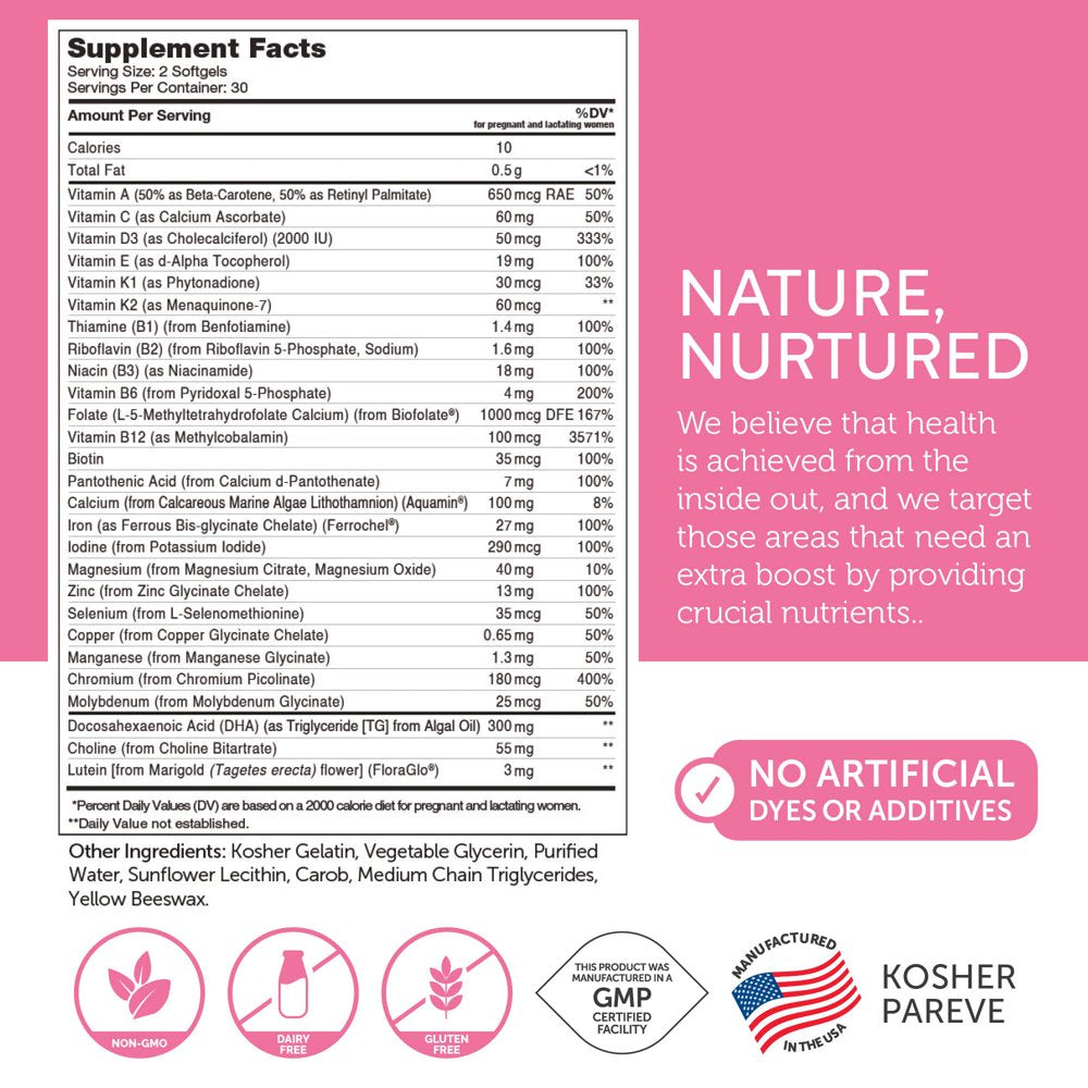 - 60 prenatal vitamin softgels per bottle