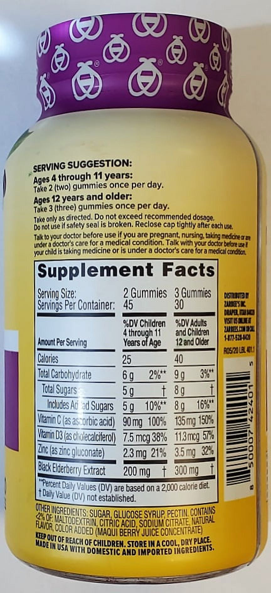 ZARBEES NATURALS BLACK ELDERBERRY WITH VITAMINS C, D & ZINC NEW 90 GUMMIES