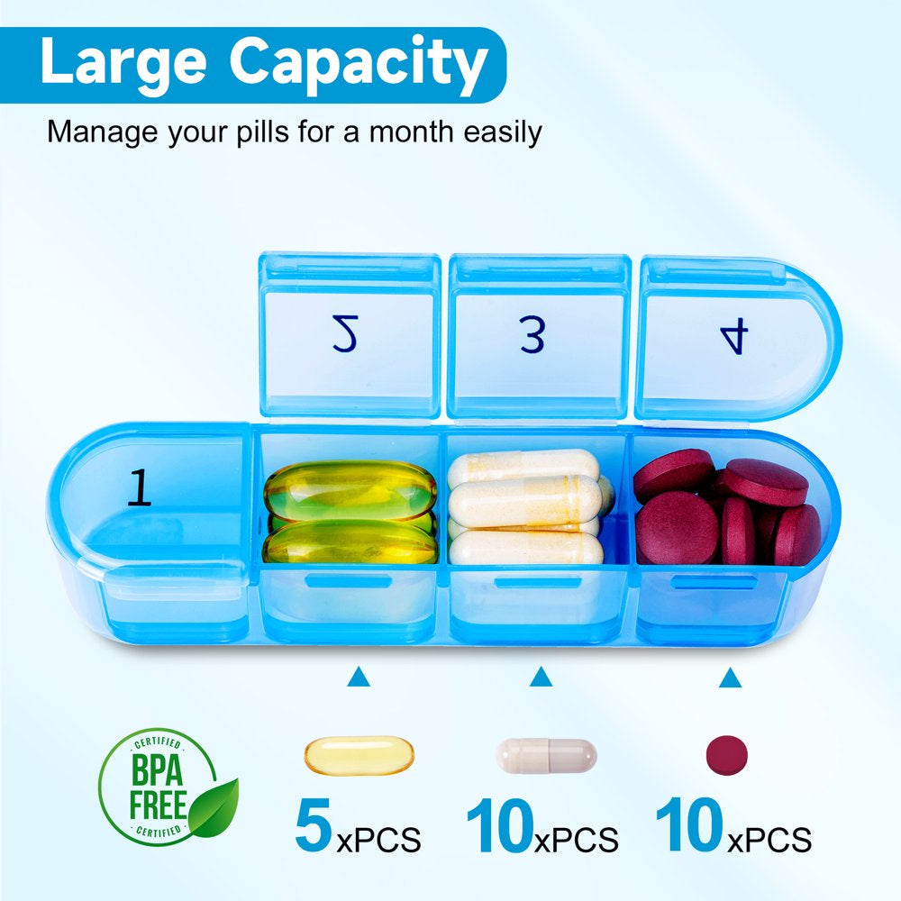 - 【Easy to Use】 The inner pill box is easy to open and close with your finger, even for the elderly or people with inflexible fingers. With snap-on lids, the inner pill case stay closed once closed. Strong outer box and inner snap closure protects your pills from spilling.