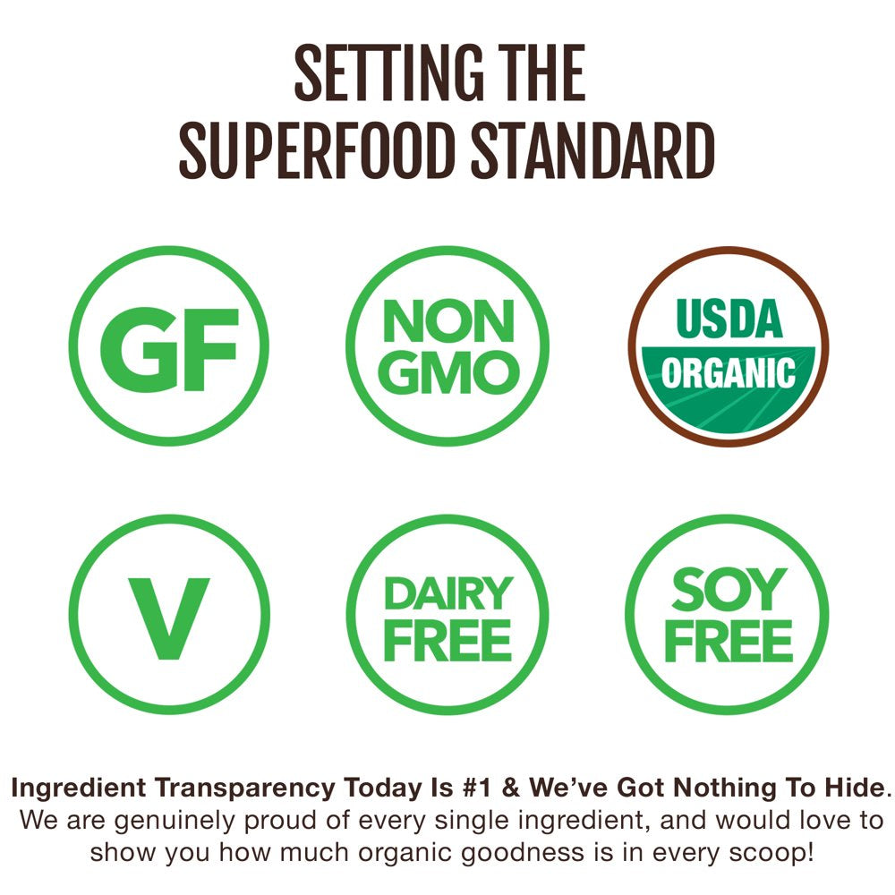 - 25 Organic Superfoods - Formulated for maximum nourishment, each scoop of our amazing superfood powder contains a carefully formulated blend of over 10 pounds of vegetables, fruits, herbs, and plants.