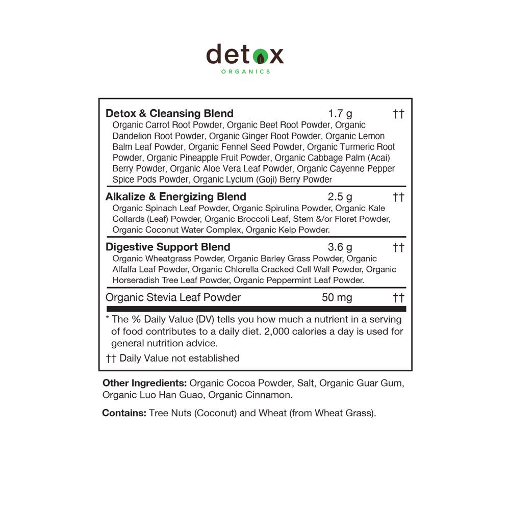 | Product Name | Detox Organics Chocolate Green Superfood Powder - Made with Organic Ingredients Like Kale, Wheatgrass, Chlorella, Spirulina, and Beet Juice |