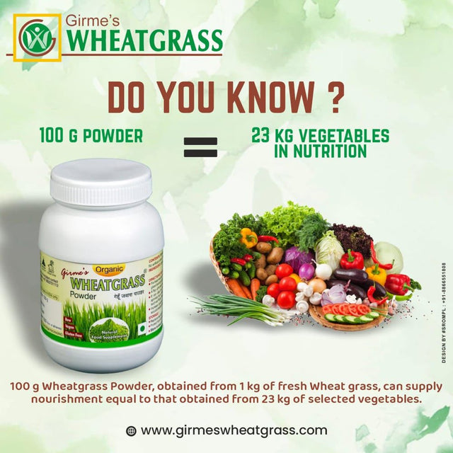 Girme's Wheatgrass are the pioneers of Wheatgrass Powder in India. Producing and promoting Wheatgrass since 1998. Wheatgrass is a naturally rich source of more 110 beneficial Phyto-nutrients, Vitamins, Minerals, Amino acids, Enzymes, Chlorophyll and Fibre Wheatgrass powder helps to improve immunity & strengthen immune system (body resistance). Easy to use for people of all age groups, ideal for travellers, mums, kids, elderly & anyone who wants convenience! Wheatgrass Powder works, make it work for you. Girme's Wheatgrass Powder - Most Reliable & The Best !!