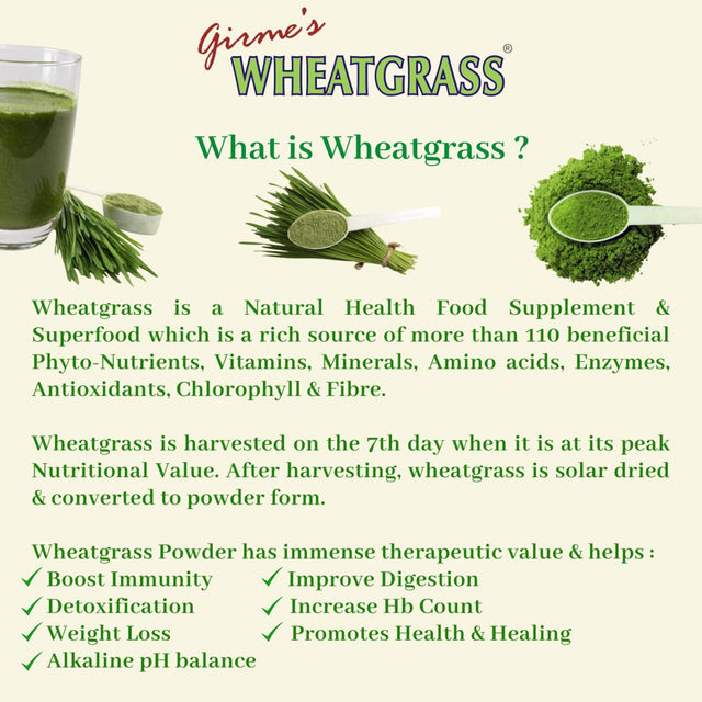 Girme's Wheatgrass are the pioneers of Wheatgrass Powder in India. Producing and promoting Wheatgrass since 1998. Wheatgrass is a naturally rich source of more 110 beneficial Phyto-nutrients, Vitamins, Minerals, Amino acids, Enzymes, Chlorophyll and Fibre Wheatgrass powder helps to improve immunity & strengthen immune system (body resistance). Easy to use for people of all age groups, ideal for travellers, mums, kids, elderly & anyone who wants convenience! Wheatgrass Powder works, make it work for you. Girme's Wheatgrass Powder - Most Reliable & The Best !!
