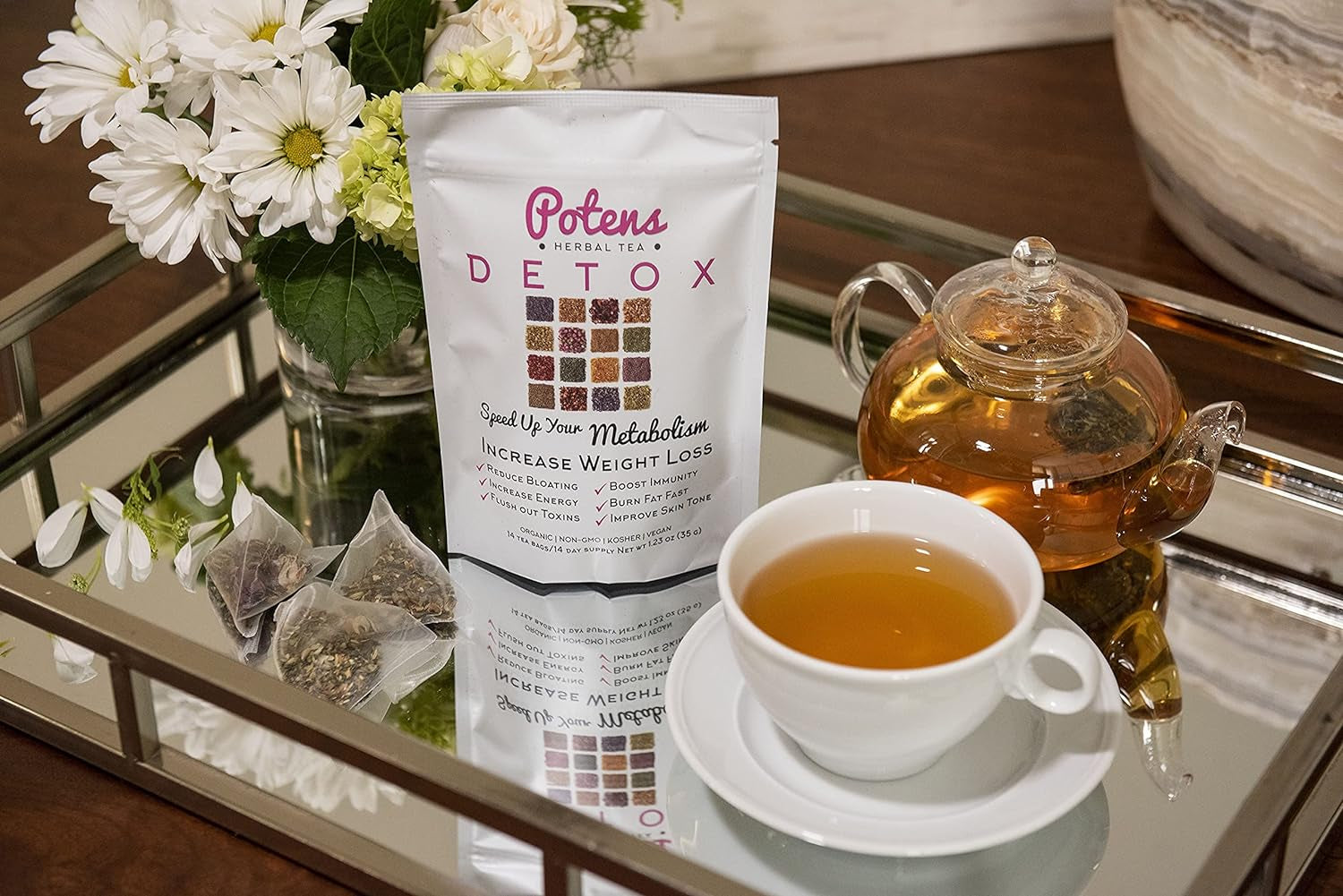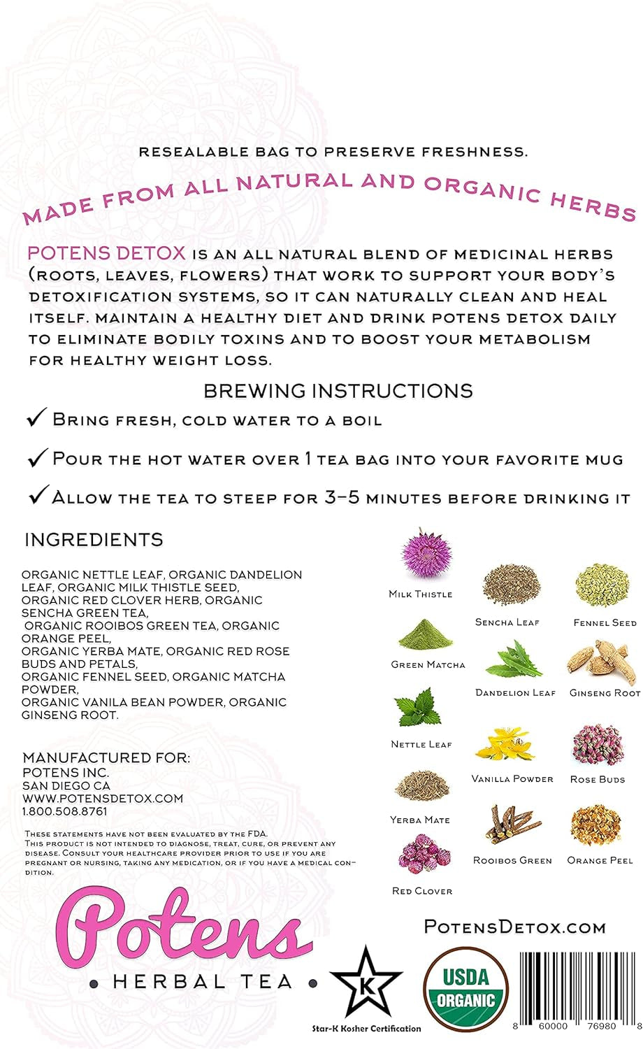 Detoxification is what our bodies do naturally on a day-to-day basis through the liver, skin, kidneys, lymphatic system, lungs and intestines. Each of these organs work to eliminate environmental toxins that we are exposed to on a regular basis and also toxic waste byproducts produced by natural metabolic processes in the body. These toxins may be stalling your weight loss progress and become the cause of allergies, puffy eyes, fatigue and depression. POTENS DETOX is made up of 12 different time- honored, 100 % organic, medicinal herbs with various properties that work together to stimulate and support your body’s detoxing organs to neutralize and eliminate toxins naturally. Most of these herbs- such as milk thistle and fennel seeds, dandelion, nettle, orange peels, rose petals, and red clover have an affinity to assist and nurture the natural function of our inherent detoxification systems. Other ingredients in this tea such as sencha green tea, green rooibos, yerba mate, green matcha powder, and ginseng root are rich sources of antioxidants, vitamins, and minerals that help to fight against free radicals and reduce inflammation and oxidative stress in the body. They also work by stimulating the metabolism, which may improve passive fat burning in the body and aid in weight loss.