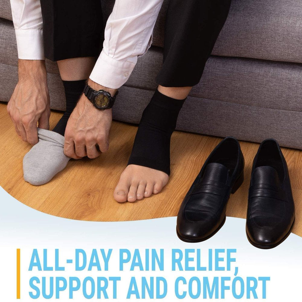 - Wear these ankle compression sleeves under your shoes and socks for pain relief in your heels caused by plantar fasciitis, injury, sprained ankle, Achilles tendonitis, edema, heel spurs, varicose veins, fallen arches, lymphedema, swollen ankles. Our toeless ankle sleeve supports your leg all day