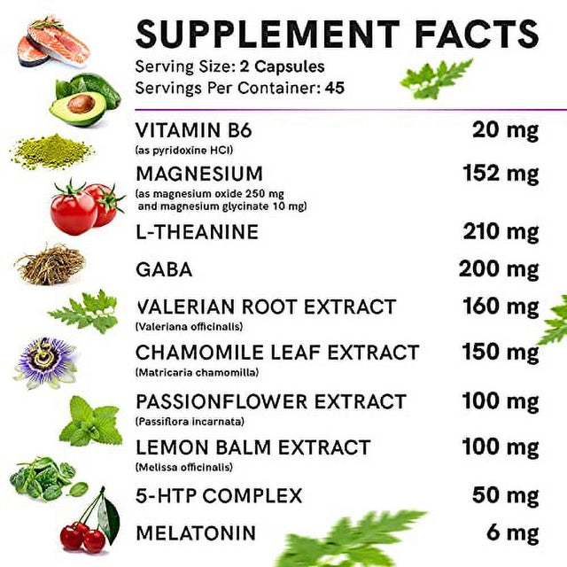 Who's this for - Our melatonin capsules are for adults who want a non-habit forming way of getting a good night s sleep. It also helps in promoting sustained energy and a positive mood.,What are the ingredients - This sleep aid supplement includes potent doses of melatonin l theanine and other key ingredients like vitamin B6, GABA, valerian root, magnesium & chamomile.,What are the benefits - Our natural sleep aid supports the body's serotonin & melatonin production. Its key ingredients can also support muscle health and brain functions.,How it works - Vegan melatonin reinforces peaceful nightly shut-eyes. Vitamin B6 promotes the body's serotonin levels while magnesium and chamomile may contribute to consistent sleep cycles.,How to take - Our sleep aid for adults is to be taken before bedtime. Take 2 capsules with a glass of water at least an hour before going to bed. Each serving has 1147mg with 5mg melatonin.