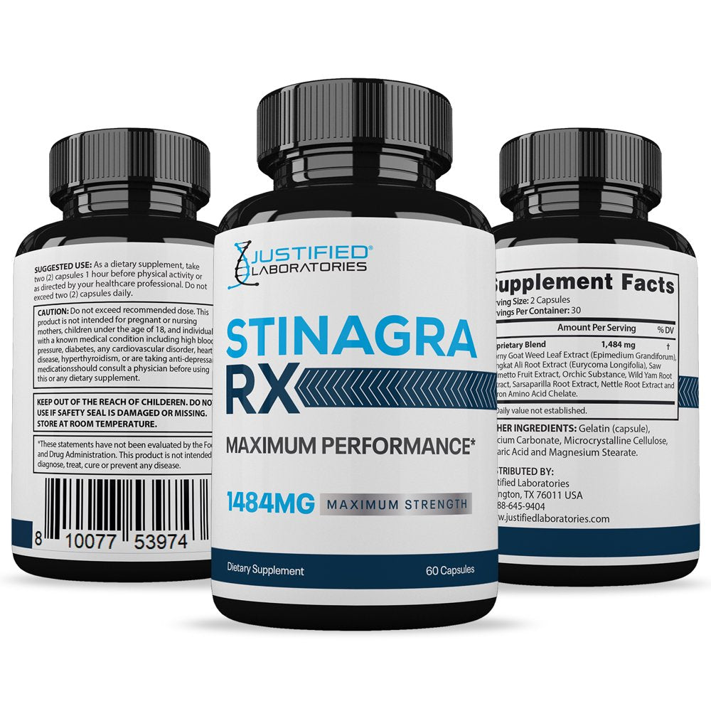 Stinagra RX is the ultimate men's health supplement - formulated to help you be at your best every day. Packed with a potent blend of ingredients, our supplement delivers 742mg in each capsule, giving you 1484mg per serving! Whether you're looking to enhance your workouts or add to your overall health, our supplement is the perfect choice for you. Our proprietary blend is non-GMO, gluten free, free from artificial colors and flavors, and is designed with your performance in mind.