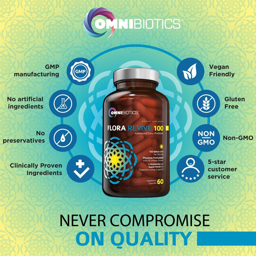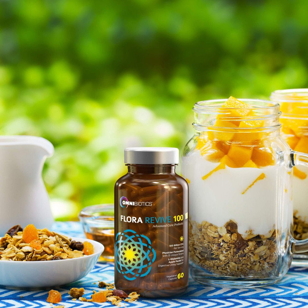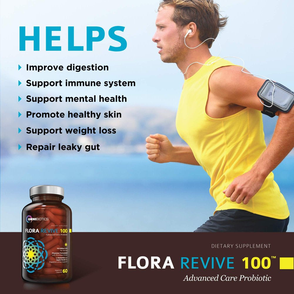 OmniBiotics Flora Revive 100 is a physician-formulated maximum-strength probiotic blend. Each serving contains over 100 billion viable cells consisting of fifteen genetically distinct probiotic strains. These are combined in Delayed Release Capsules with prebiotics, L-Glutamine, and Apple Pectin to create a high potency probiotic product like no other. PREBIOTICS HELP BOOST PROBIOTIC BACTERIA – Inulin and Apple Pectin naturally feed the healthy intestinal microflora that populate the gut. They serve as substrates that allow probiotics to colonize the gut more efficiently, increasing the population of good bacterial species like Bifidobacterium and Lactobacilli. These beneficial bacteria in turn assist with digestion and absorption of your food and play a significant role in your immune function. Together, prebiotics and probiotics work to support digestive processes, the immune system, and general health. L-GLUTAMINE is an essential amino acid that supports a healthy inflammatory response and is highly beneficial to the growth and repair of your intestinal lining. L-glutamine acts as a protector, coating your cell walls and helping to repel irritants.