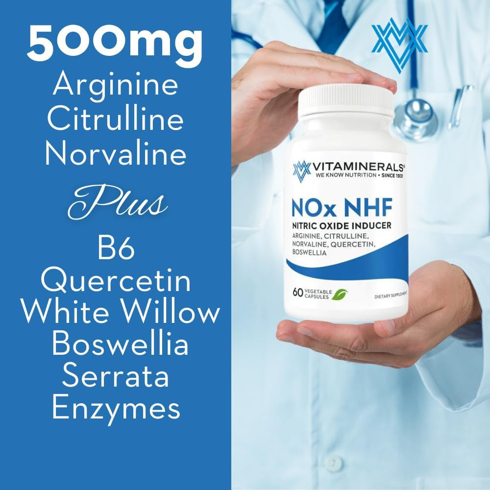 122 Nox NHF L-Arginine, L-Citrulline, L Norvaline plus B6, Quercetin, White Willow, Boswellia & Enzymes | 60 Veggie Caps | 30 Servings