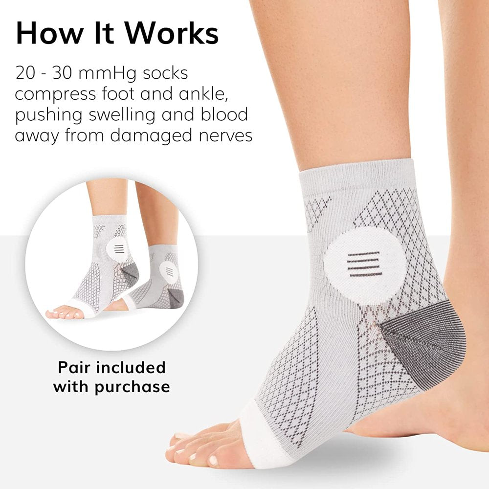- Available in a pair of two, the toeless compression socks provide relief from diabetic and nerve damage pain; lightweight neuropathy stockings decrease swelling, increase circulation, and improve proper blood flow throughout your feet and ankles.