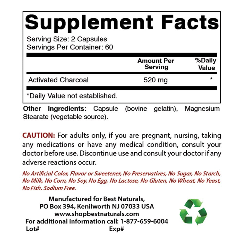 - Activated Charcoal 280 mg per capsule -- 120 Capsules per bottle.