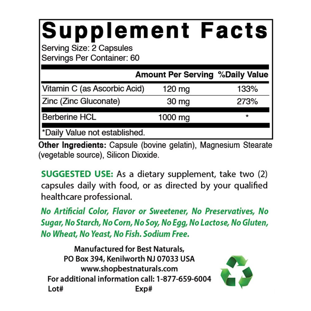 Berberine plus supplies high potency berberine combined with Vitamin C and Zinc for healthy immune support.Berberine has shown to help maintain healthy blood sugar and cholesterol levels that are already within normal range. Bebeerine capsules have also shown to help support weight loss, digestion and immune health.Our Berberine pills are made using the highest quality of Bebeerine with vitamin c & Zinc. Bebeerine has been used for years in traditional Chinese and Ayurvedic medicine as a natural defenseOur Berberine 1000mg contains Berberine 1000 mg, Zinc 30 mg & Vitamin C 120 mg per serving - 120 capsules per bottleNo Artificial Color, Flavor or Sweetener, No Preservatives, No Sugar, No Starch, No Corn, No Egg, No Lactose, No Gluten, No wheat, No Yeast, No Fish. Sodium Free.TOP QUALITY GMP CERTIFIED PRODUCTS - All Best Naturals products are manufactured in accordance with Good Manufacturing Practices (GMP), among the highest standards in the world -- Proudly Made in USA -- Purity & Potency GuaranteedDuring the summer months products may arrive warm but Amazon stores and ships products in accordance with manufacturers' recommendations, when provided.