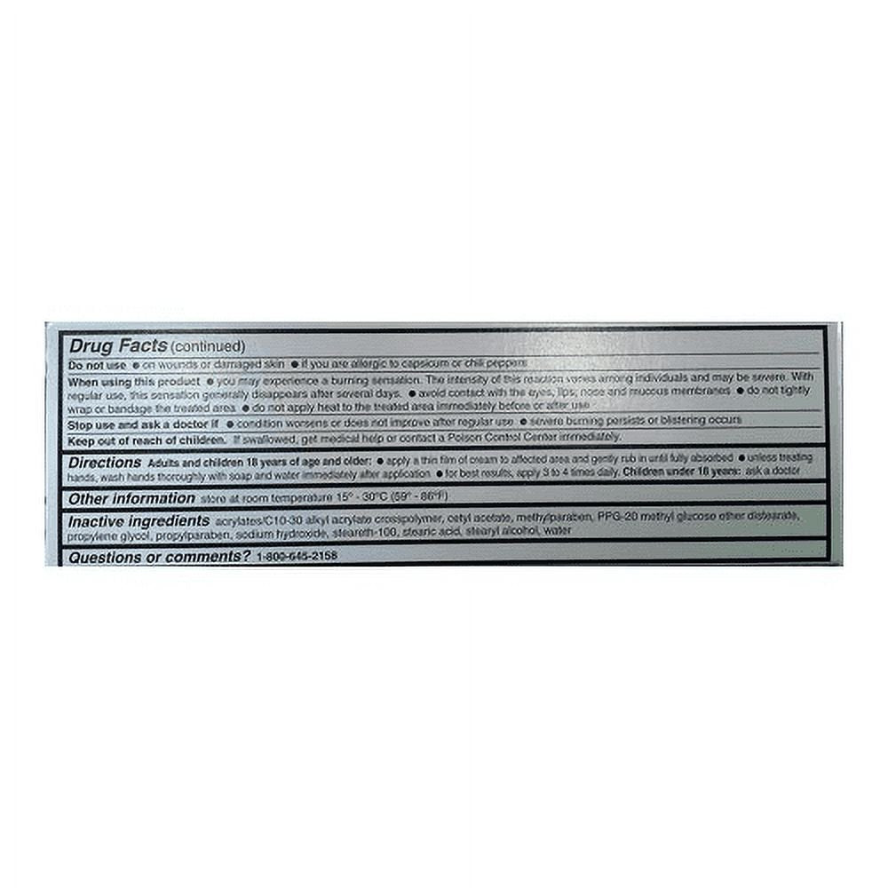 Capsaicin 0.025%. Odor Free. No. 1 Doctor Recommended. No. 1 Pharmacist Recommended. Contains purified capsaicin, a penetrating pain reliever recommended by doctors.