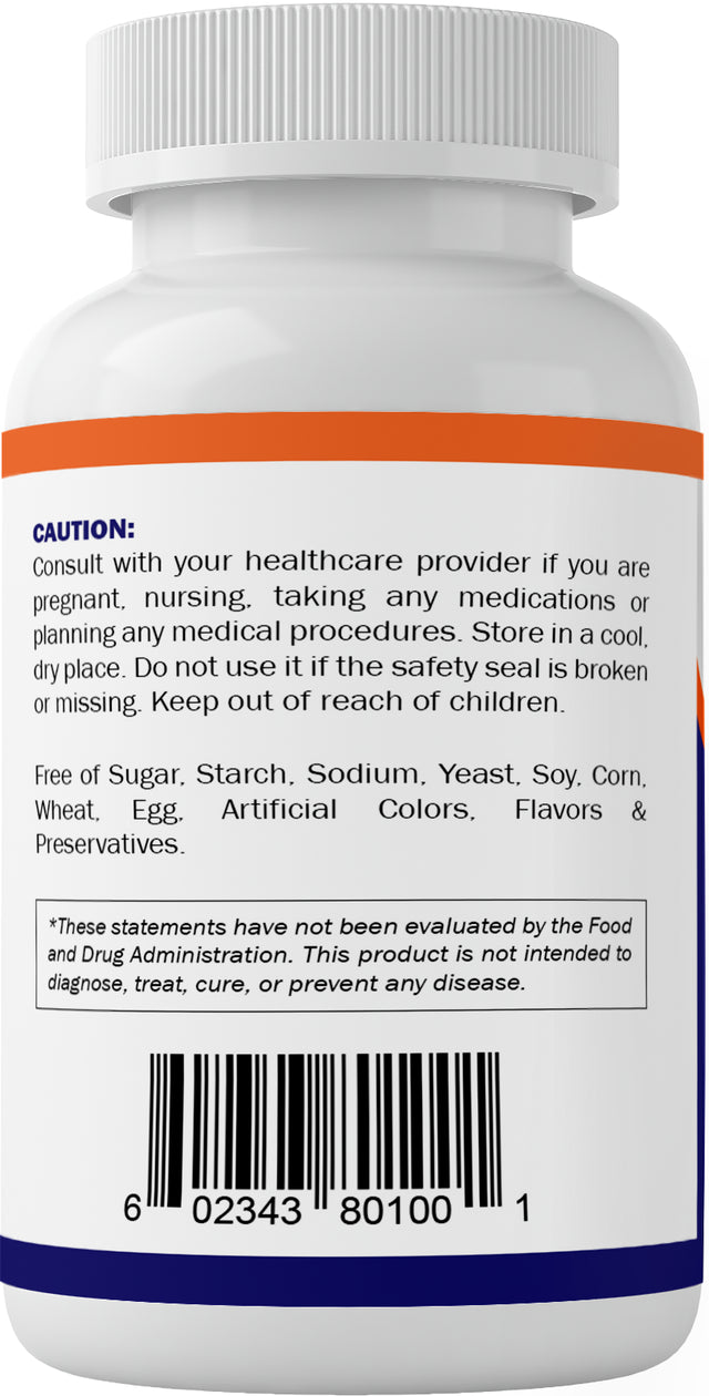 - Free of sugar, starch, soy, yeast, corn, wheat, egg, artificial color, flavor, & preservatives.