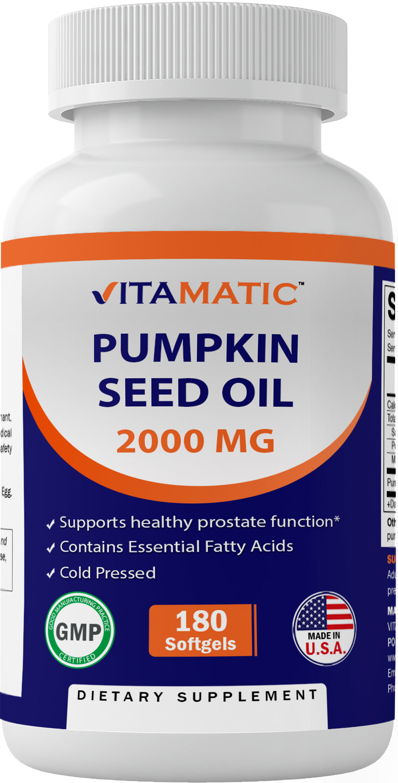 2 Pack - Vitamatic Pumpkin Seed Oil 2000mg Softgel Capsules per serving - 180 Softgels - (1000 mg per Softgels) total 360 softgels. At Vitamatic our mission consists of 3 major pillars: Premium quality ingredients: We strive to provide natural supplements created with pure and top quality ingredients to promote optimal health and performance. Competitive pricing: We offer affordable pricing, because we believe that every individual committed to a better quality of life should have the opportunity to do so without financial burdens. Superior service: We pride ourselves in how we support and guide our customers on their wellness journey to help meet their health goals