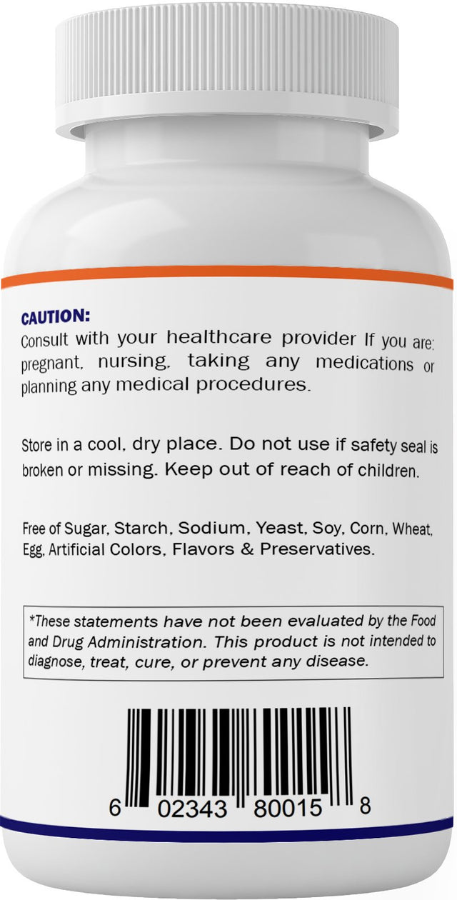 Free of sugar, starch, sodium, soy, yeast, corn, wheat, egg, artificial color, flavor & preservatives.