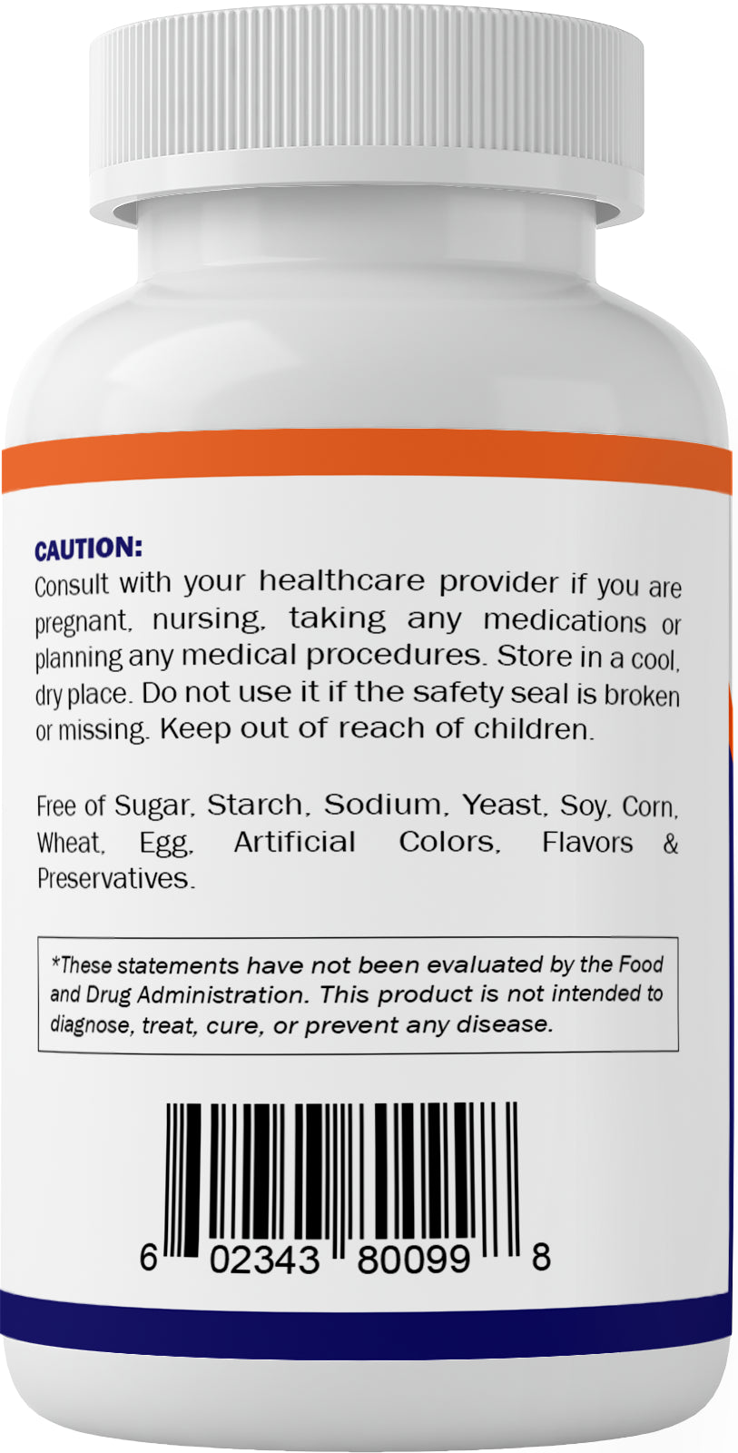 - Free of sugar, starch, soy, yeast, corn, wheat, egg, artificial color, flavor, & preservatives.