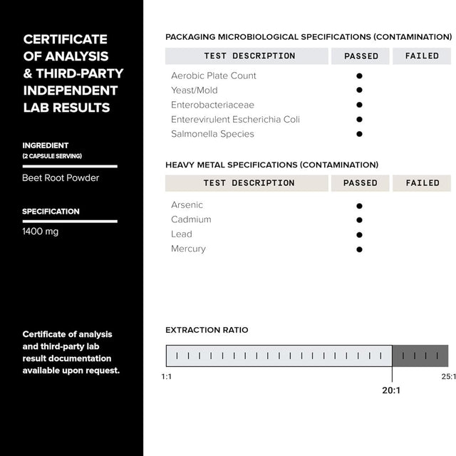 - Setting a new standard for purity: To ensure that you are getting a high-quality beet root supplement, each batch is tested for quality and purity both during and after manufacturing.