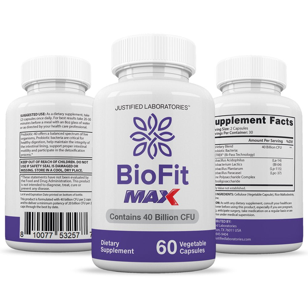 Our Biofit Max Probiotic Supplement, a one-of-a-kind formula designed to promote overall health and provide a powerful dose of beneficial probiotic ingredients. Our unique Max probiotic has a potency of 40 Billion CFU compared to our standard formula which contains 1.5 Billion CFU. This Probiotic Supplement is made with a variety of ingredients and is free from harmful additives, preservatives, and artificial colors. These easy-to-swallow capsules can be taken once a day, providing a convenient and hassle-free addition to your daily routine.