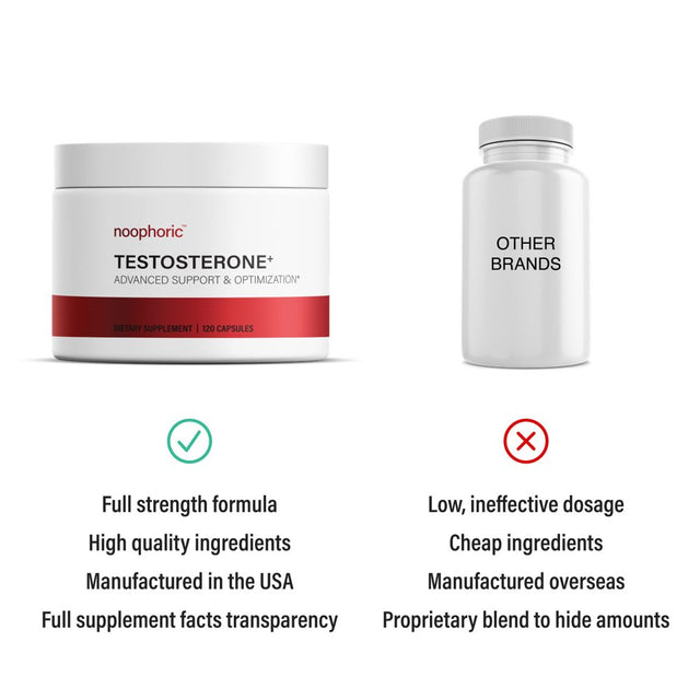 Noophoric Testosterone+ is a natural testosterone supplement for men. Formulated to enhance libido, improve energy levels, build muscle, and promote men's health. Key ingredients like Fadogia Agrestis, Tongkat Ali (LongJack), and Ashwagandha work to support healthy testosterone levels and improve overall well-being. Feel like a new man with all-day energy and increased cognitive function. Noophoric testosterone booster and other products are manufactured in the United States in a GMP-certified facility using ingredients sourced from around the world. Take 4 capsules each morning. *These statements have not been evaluated by the Food and Drug Administration. This product is not intended to diagnose, treat, cure or prevent any disease.