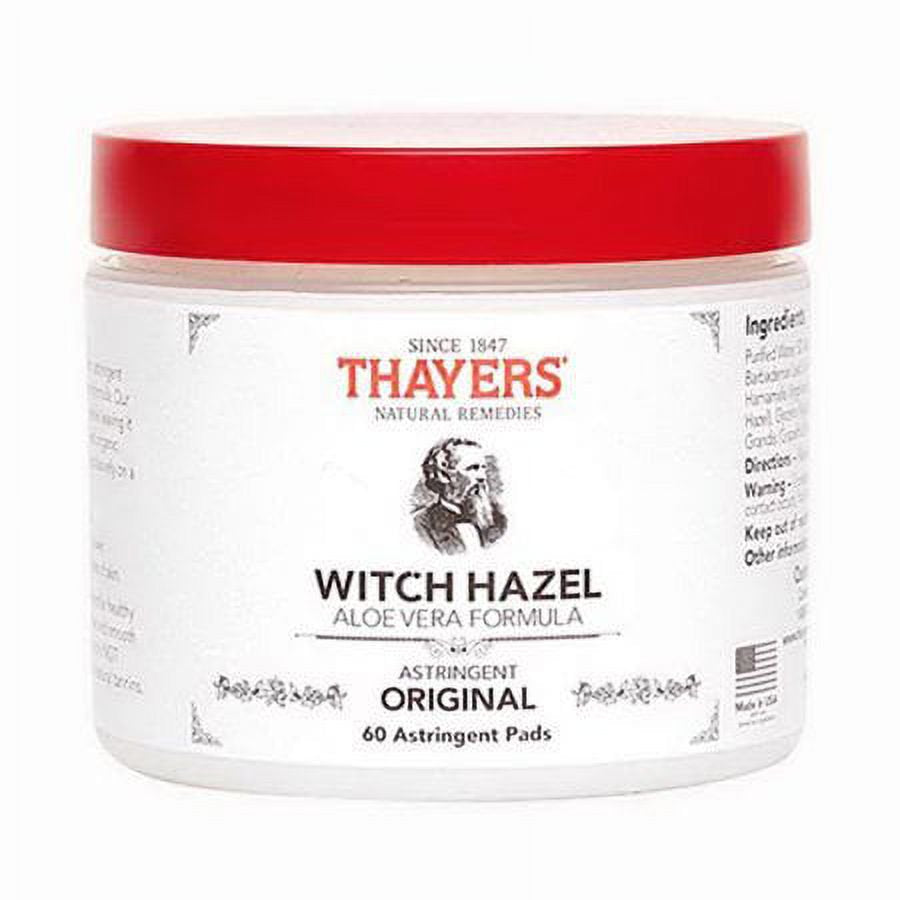 Thayers Original Witch Hazel Aloe Vera Formula Astringent Pads 60 Ct Thayers Witch Hazel Astringent Pads Original With Aloe Vera - 60 PadsThayers Witch Hazel Astringent Pads Original With Aloe Vera is ready to provide their proprietary skin-soothing treatment in the car, plane, train or boat, in the woods, by the beach or anywhere else. Thayers Witch Hazel with Aloe Vera Formula Astringents and Alcohol-Free Toners have been soothing, softening, healing and stimulating skin .